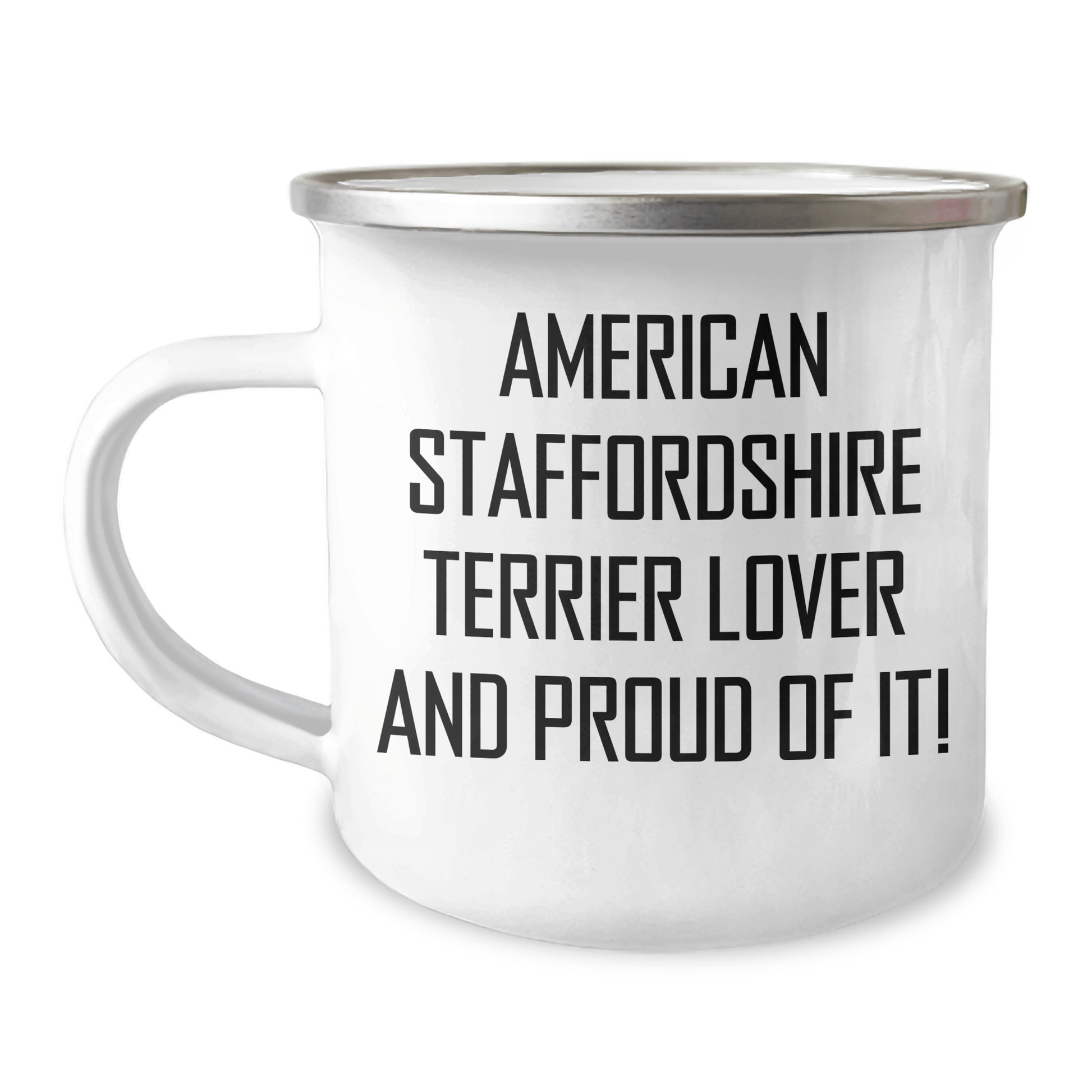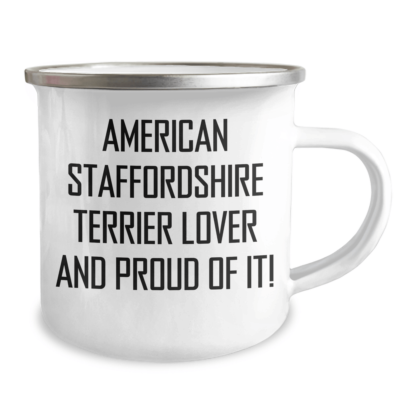 - Show off your love for American Staffordshire Terrier Dogs with this unique 'American Staffordshire Terrier Lover And Proud Of It!' Camping Mug, perfect for outdoor enthusiasts and dog lovers alike, with its durable stainless steel construction and enamel finish.