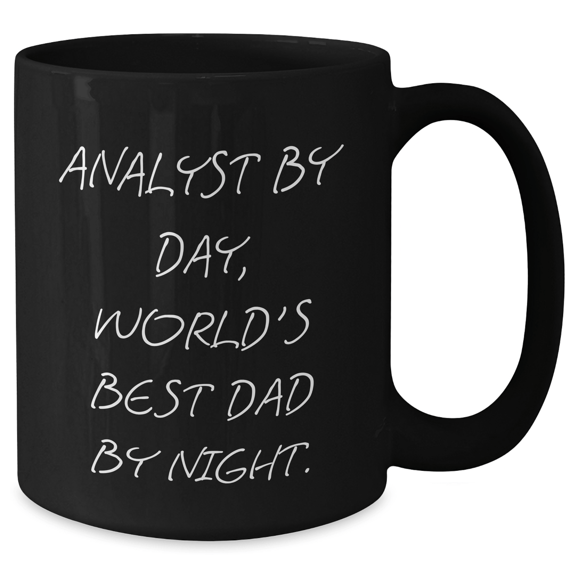 - Start your day off right with this Analyst-approved black coffee mug, perfect for the 'Analyst By Day, World's Best Dad By Night.' graduate in your life. This high-quality ceramic mug is designed to keep your coffee hot and your hands warm, with a comfortable 11oz or 15oz capacity. Plus, it's microwave and dishwasher safe for easy cleaning.