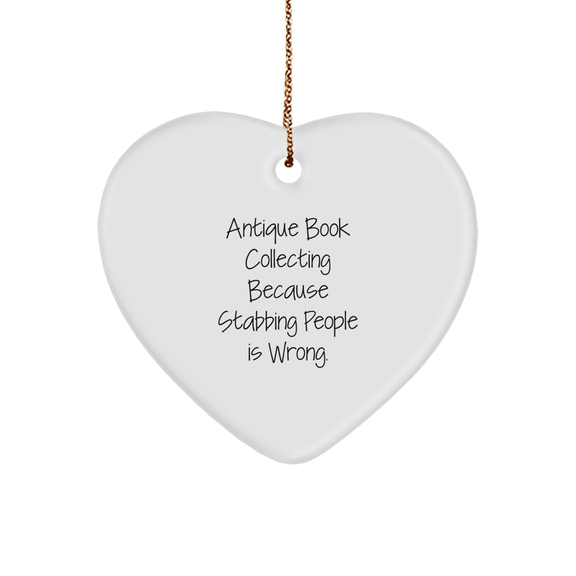 - A unique and humorous gift for antique book collecting enthusiasts - 'Antique Book Collecting Because Stabbing People Is Wrong.' quote adds a touch of humor to this heart-shaped ornament. Perfect for men, women, or family members who appreciate a good laugh.