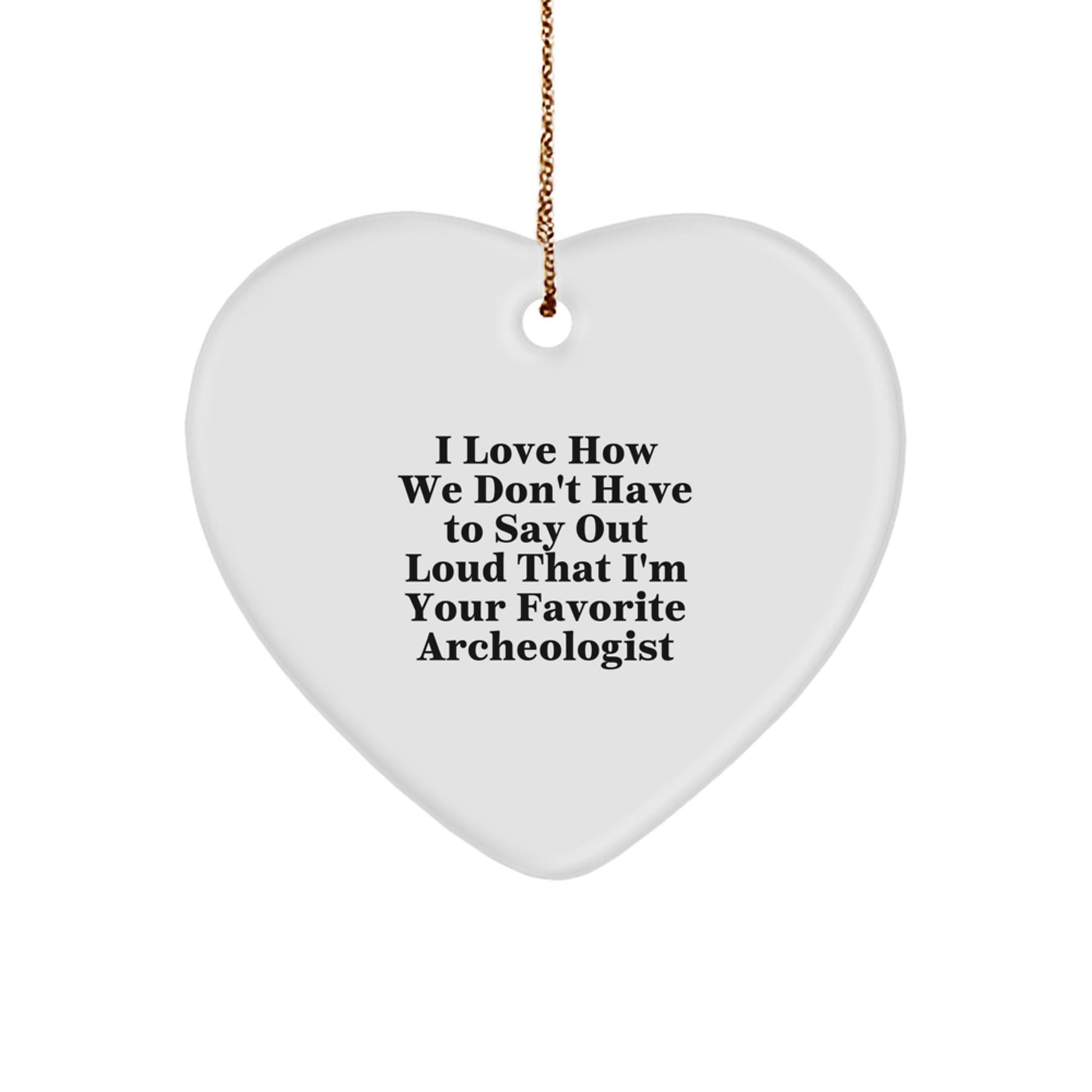 Are you an archeologist or know someone who is? This heart-shaped ornament is the ideal gift! With the quote 'I Love How We Don't Have To Say Out Loud That I'm Your Favorite Archeologist' in a funny and playful tone, it's sure to bring a smile to anyone's face. The ornament is crafted from sturdy MDF with a high-gloss plastic finish and is vibrantly printed from edge-to-edge via Sublimation, ensuring bright and vivid colors. It's lightweight and resistant to breaking, making it a great choice for households with children or pets. The festive gold cord makes it easy to hang and perfect for stress-free decorating. Whether you're sending it as a gift to a loved one or keeping it for yourself, this ornament is sure to be a treasured addition to any collection.