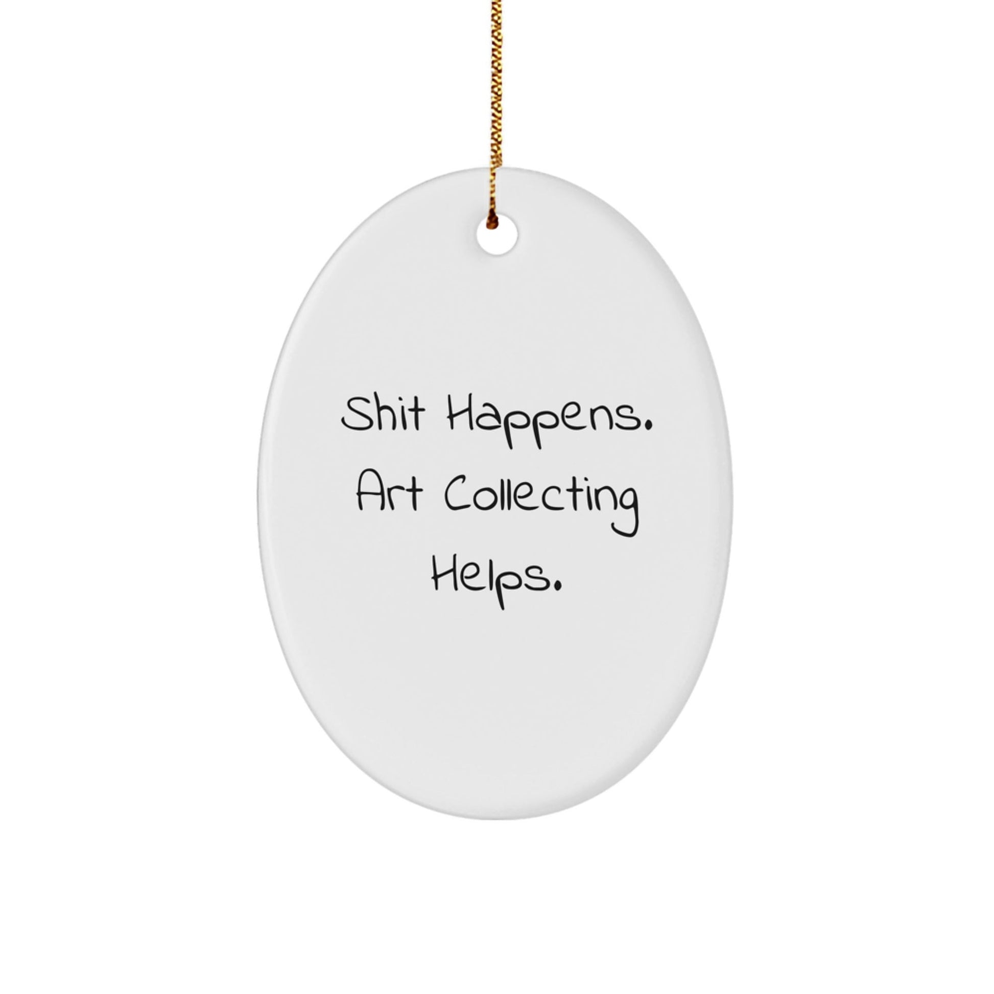 Get ready to spread some laughter and joy with this unique oval ornament that says 'Shit Happens. Art Collecting Helps.'! A great gift for art collecting enthusiasts, this ornament is a fun way to add some humor to their holiday decor. Whether you're shopping for friends, family, or coworkers, this ornament is sure to bring a smile to their face.