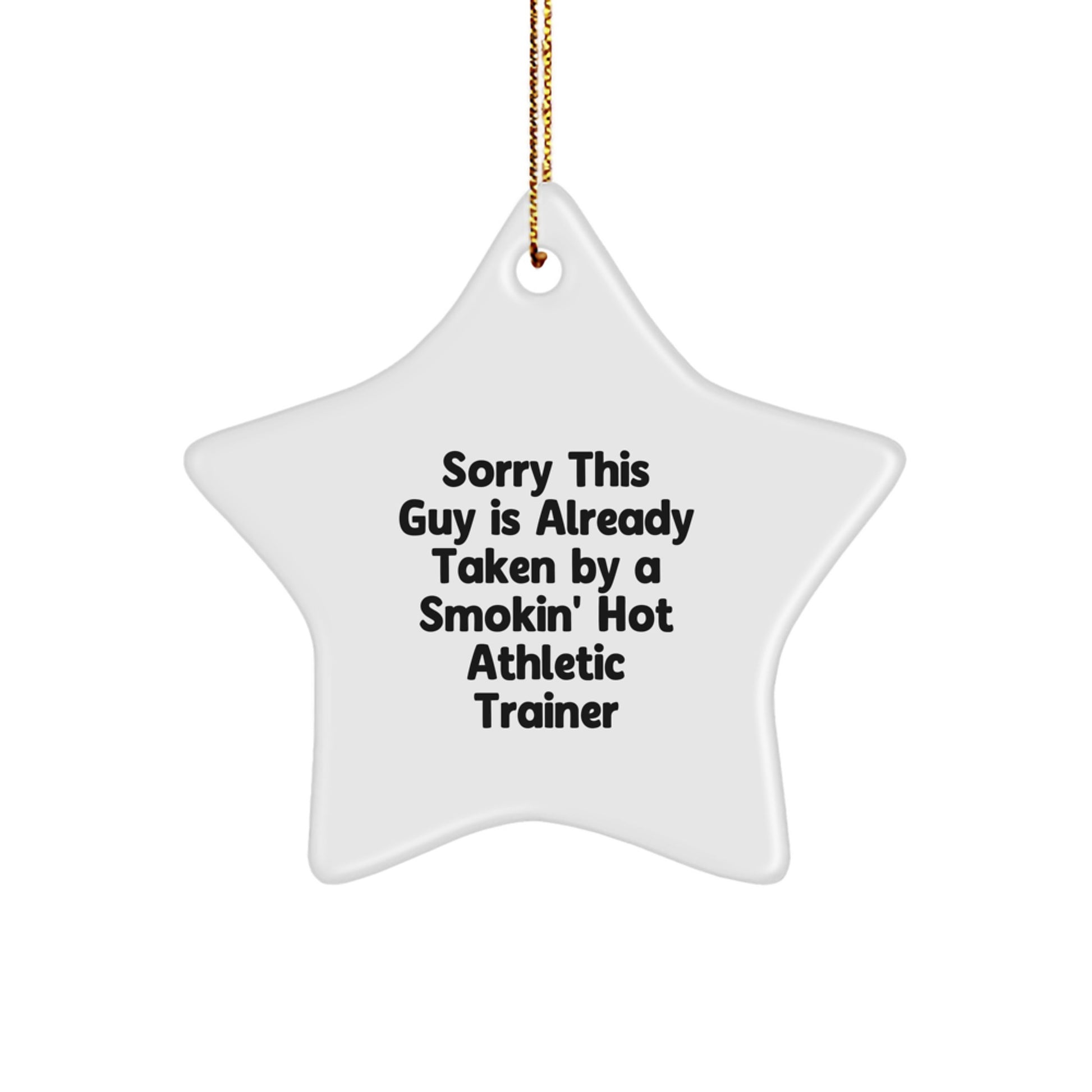 - This Sorry This Guy Is Already Taken By A Smokin' Hot Athletic Trainer Star Ornament is a unique and funny gift for the athletic trainer in your life, perfect for showing appreciation for their hard work and dedication.