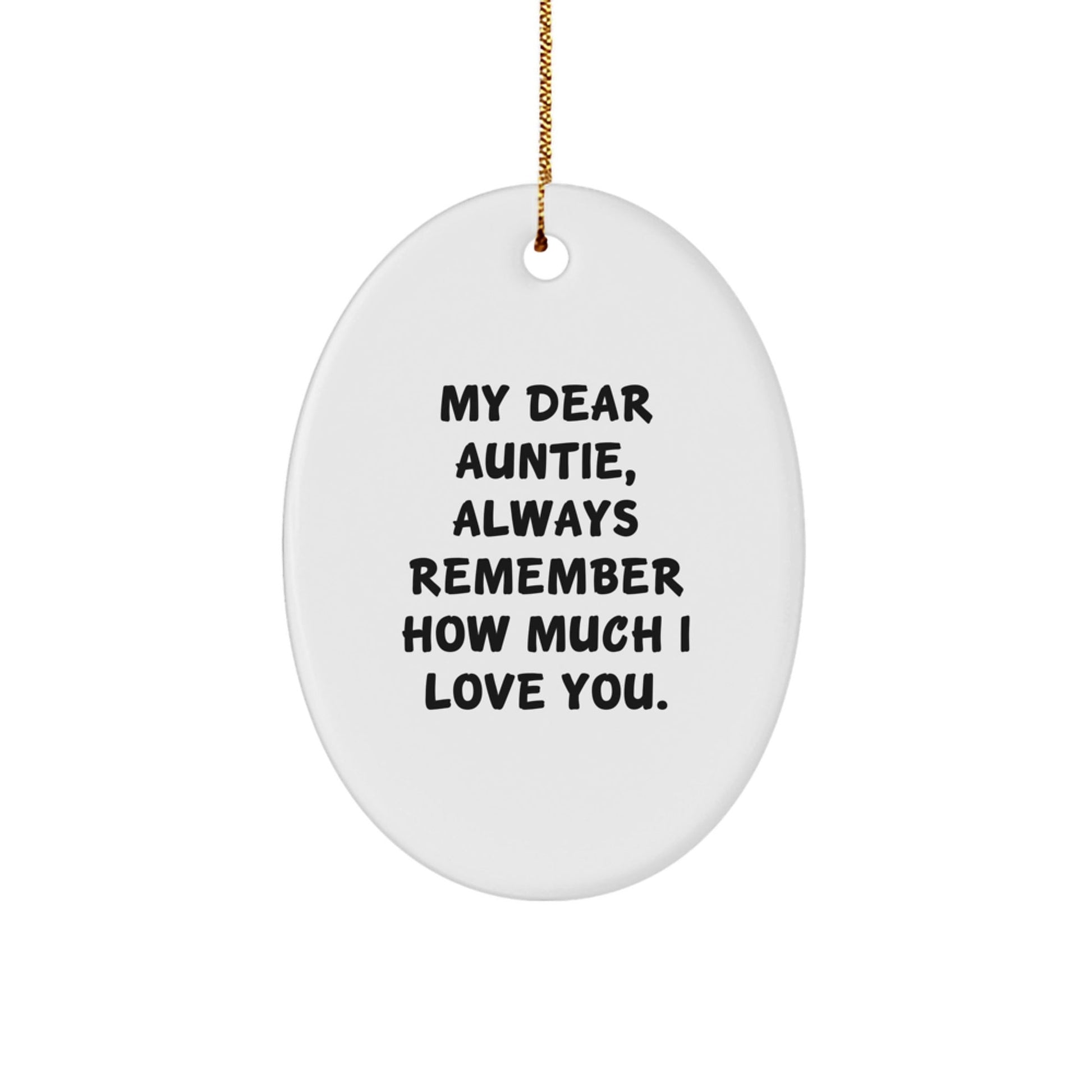 - A beautifully crafted Oval Ornament with a funny quote 'My Dear Auntie, Always Remember How Much I Love You' to show your aunt how much you care