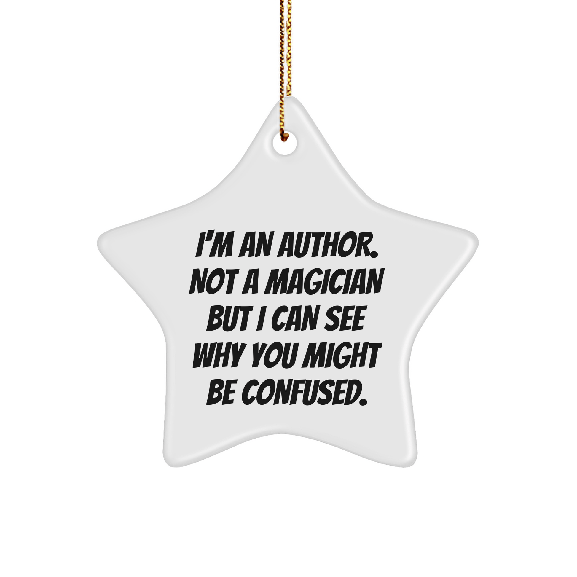 As an author, they know that writing is a challenging but rewarding profession. This ornament is a fun way to acknowledge their hard work and dedication to their craft. The funny quote 'I'm An Author. Not A Magician But I Can See Why You Might Be Confused.' adds a touch of humor to the design, making it a great conversation starter.