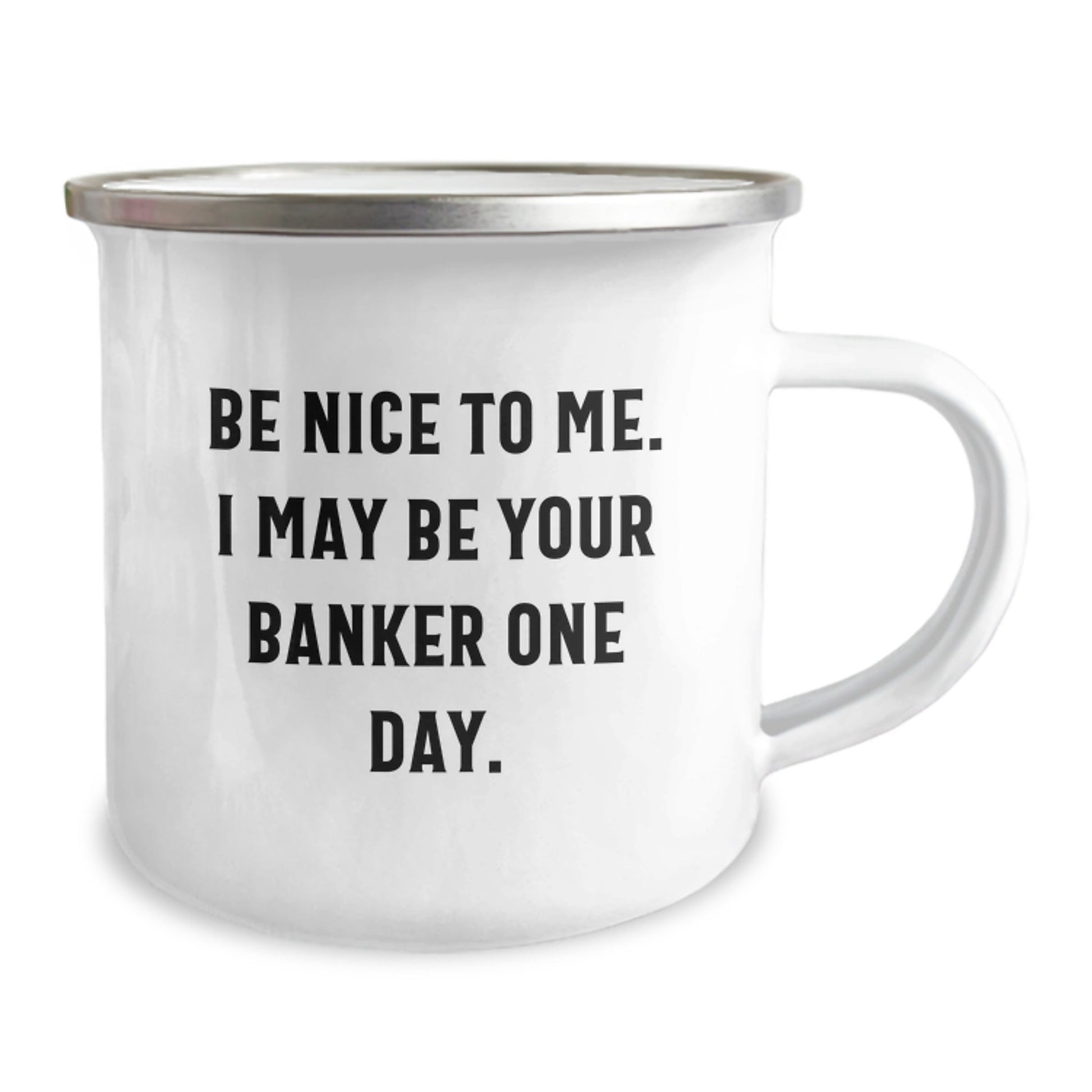 - The quote 'Be Nice To Me. I May Be Your Banker One Day.' adds a touch of humor and personality to this camping mug, making it a unique gift for any Banker