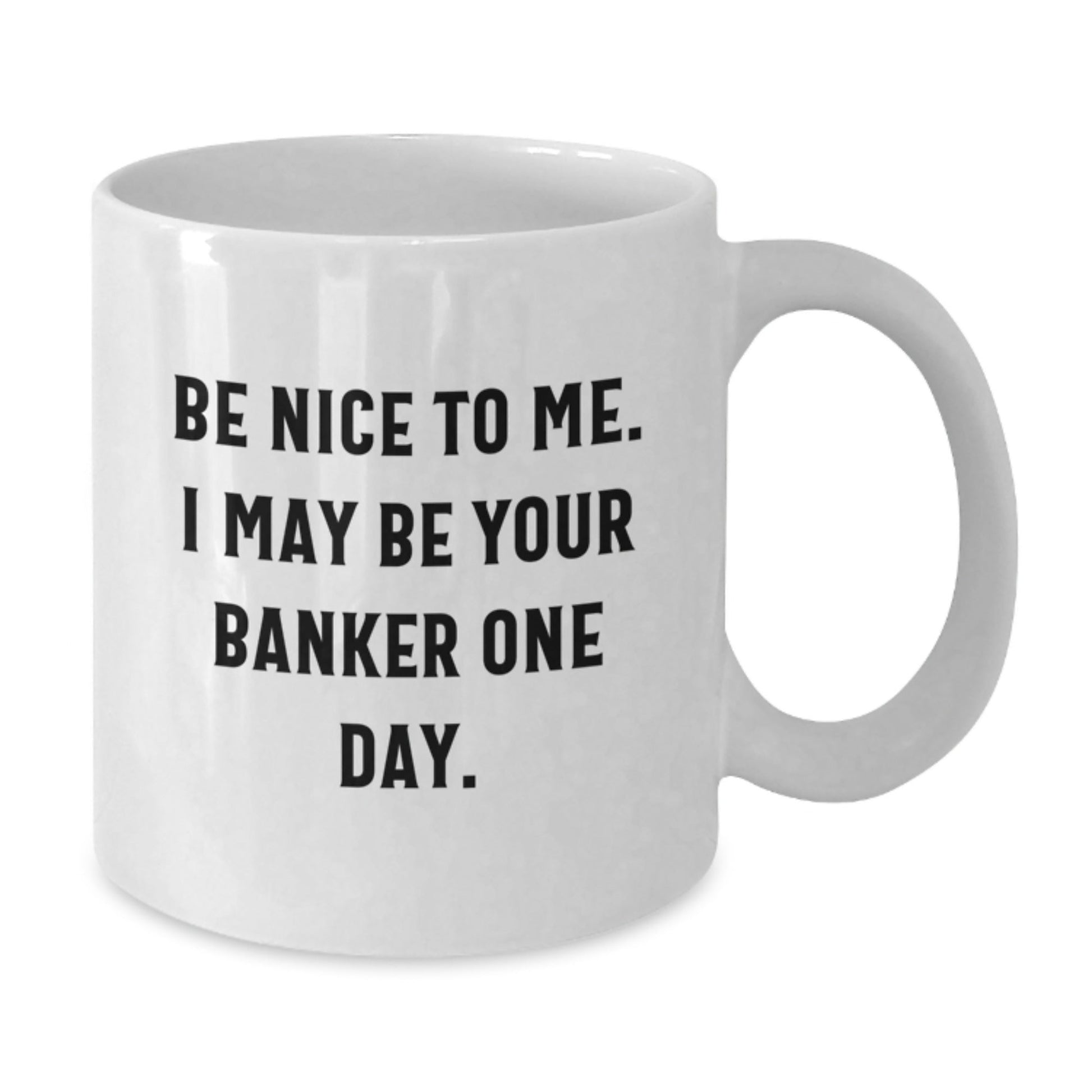 Are you searching for a unique gift for a Banker in your life? Look no further! This Be Nice To Me. I May Be Your Banker One Day. White Coffee Mug is the perfect way to show your appreciation for their hard work and dedication. Made from high-quality ceramic, this 11oz or 15oz mug is microwave and dishwasher safe, making it easy to clean and use. Whether you're a friend, family member, or coworker, this gift is sure to bring a smile to their face. So why not treat your favorite Banker to a little something special? They'll appreciate the thought and humor behind this funny quote. And who knows, they may even become your Banker one day!