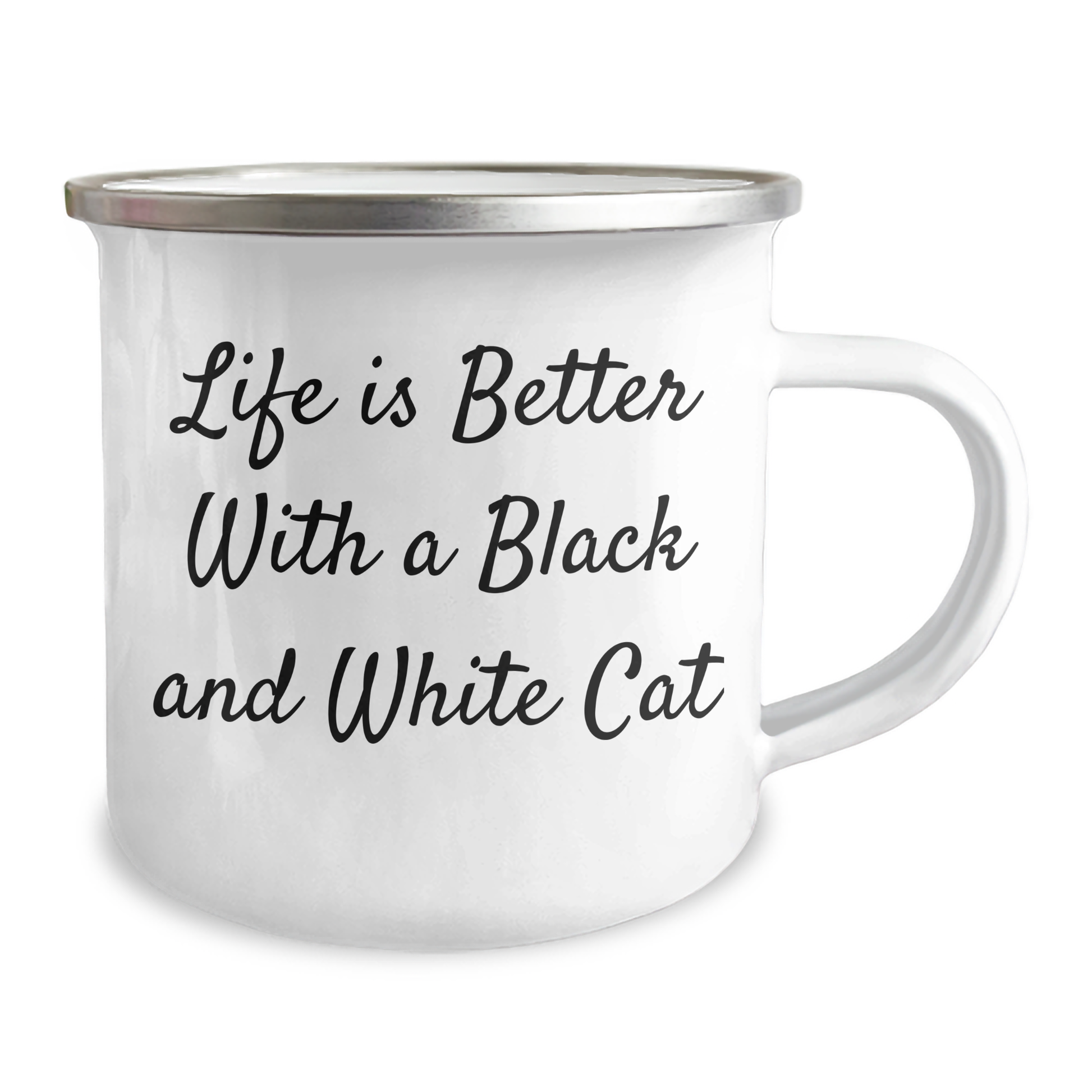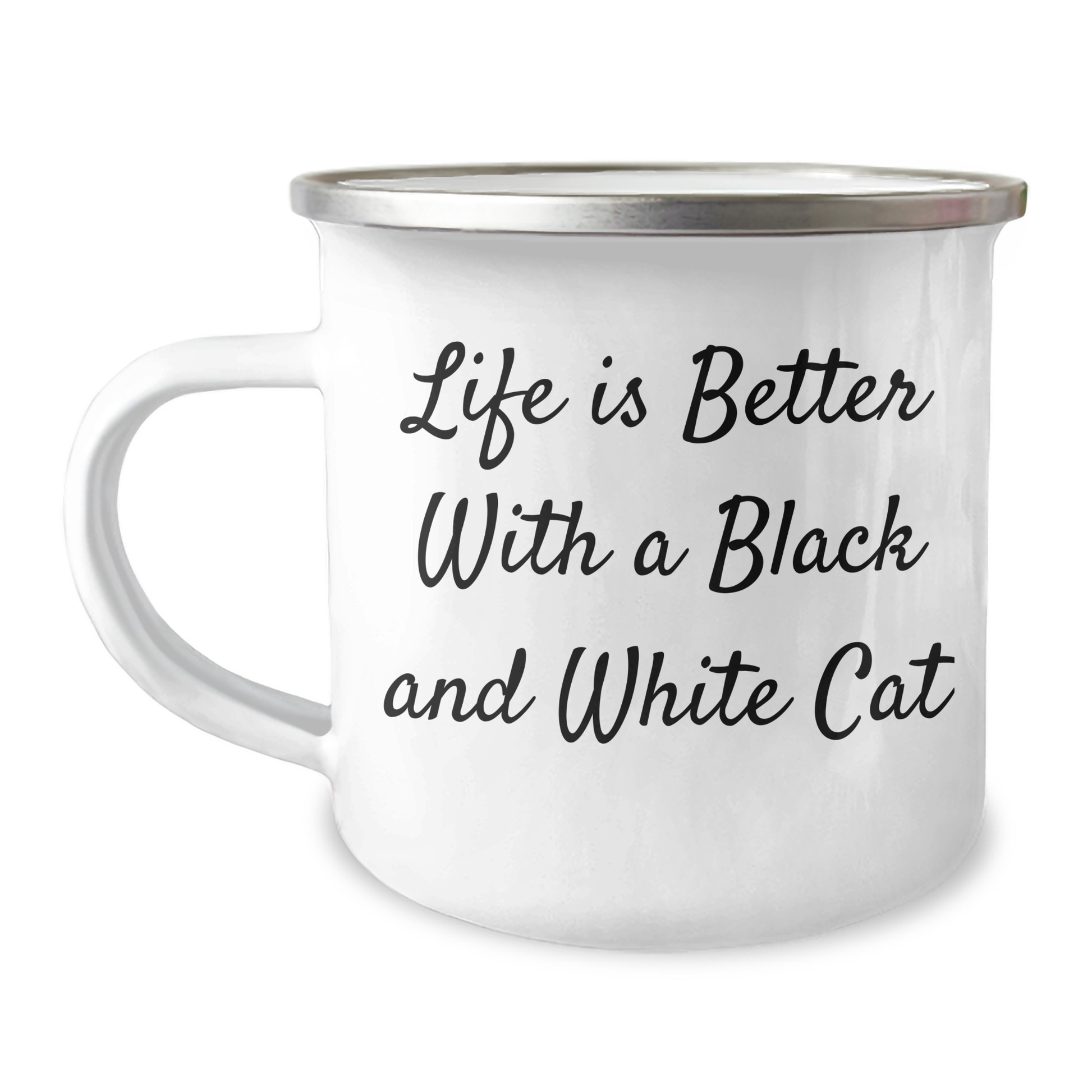 Are you a Black and White Cat enthusiast or looking for a thoughtful gift for someone who loves these adorable felines? Look no further! This camping mug is the perfect way to show off your love for Black and White Cats. The quote 'Life Is Better With A Black And White Cat' is a humorous and heartwarming reminder of the joys of sharing life with our feline friends. Make it a unique Father's Day gift for the special man in your life, or a thoughtful present for coworkers, friends, or family who appreciate the beauty of Black and White Cats. The stainless steel construction with enamel finish ensures durability and easy cleaning, while the 12 oz capacity is perfect for a hot cup of coffee or tea on a camping trip or a relaxing morning at home.