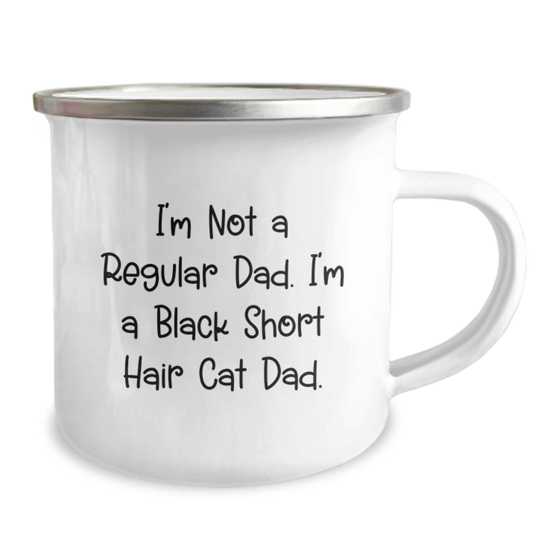 Get ready to delight Black Short Hair Cat enthusiasts with this unique Camping Mug! As a proud Black Short Hair Cat Dad, you'll love sipping your morning coffee or tea from this thoughtful gift. The quote 'I'm Not A Regular Dad. I'm A Black Short Hair Cat Dad.' is a funny and cute way to express your love for your feline friend. This 12 oz capacity stainless steel mug with enamel finish is perfect for daily use. Hand washing with mild detergent is recommended. The permanent printing ensures the design won't fade after washing. Whether you're a mom, dad, or just a Black Short Hair Cat lover, this gift is sure to bring a smile to their face. Make it an unforgettable Birthday with this thoughtful and personalized gift from you to your loved one.
