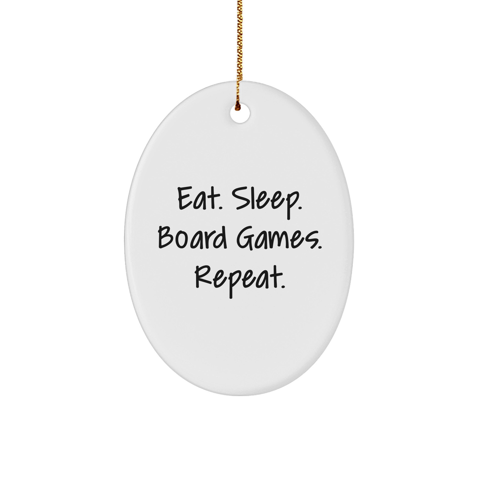 This Oval Ornament is a great way to show your friends that you care about their love for board games. Whether you're giving it as a birthday gift, holiday present, or just a random act of kindness, it's sure to brighten up their day. So why wait? Get your Eat. Sleep. Board Games. Repeat. Oval Ornament today and make it a Christmas to remember!