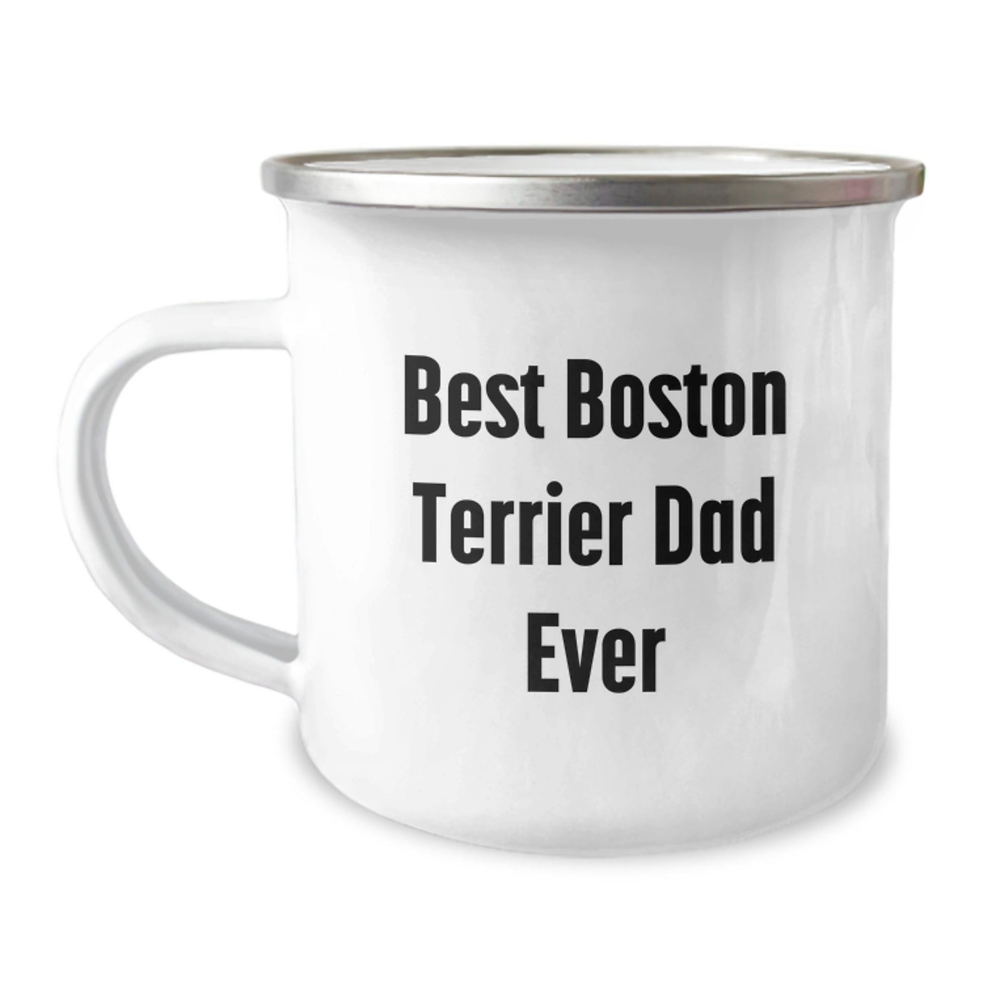 - 'Best Boston Terrier Dad Ever' quote on a 12 oz camping mug for hot or cold beverages