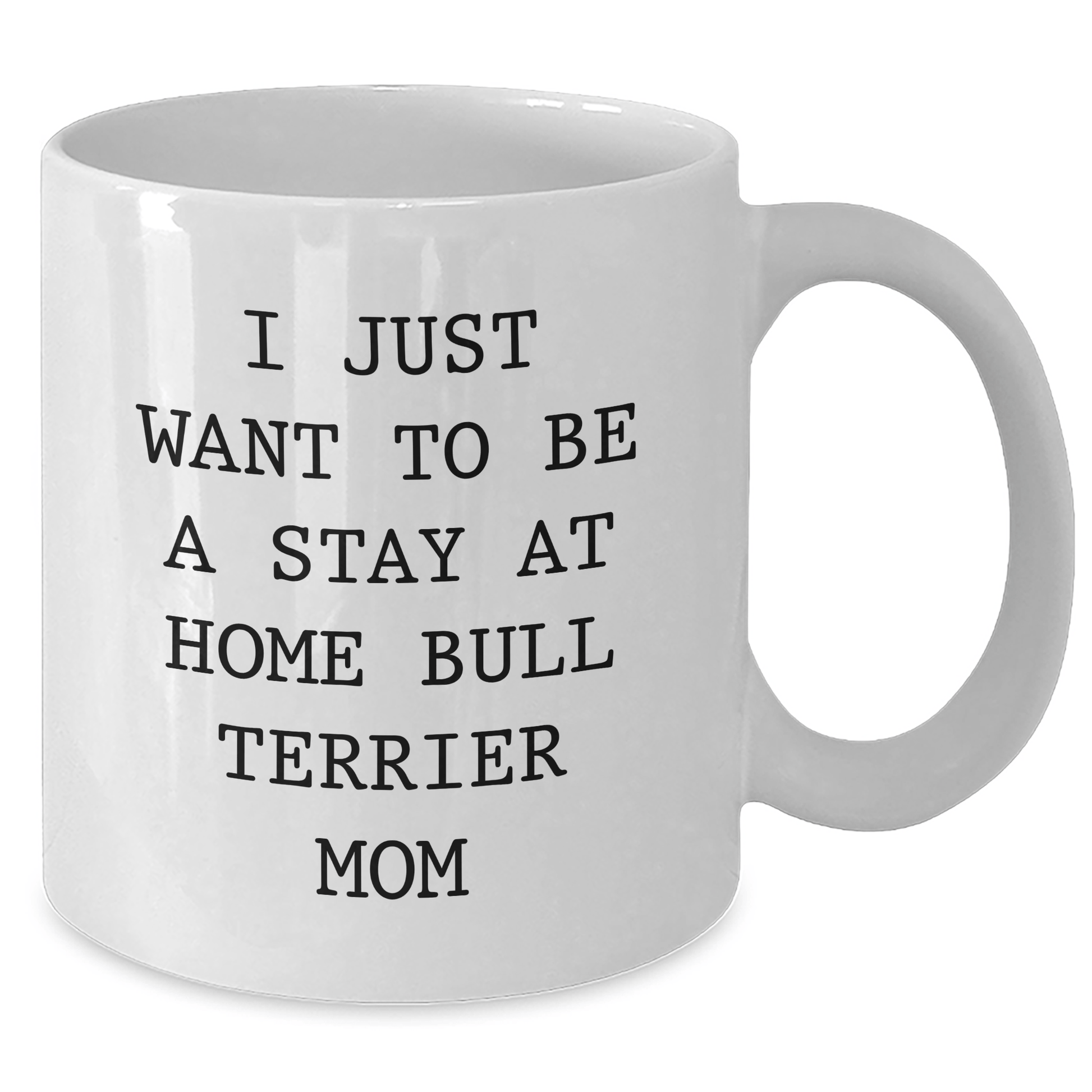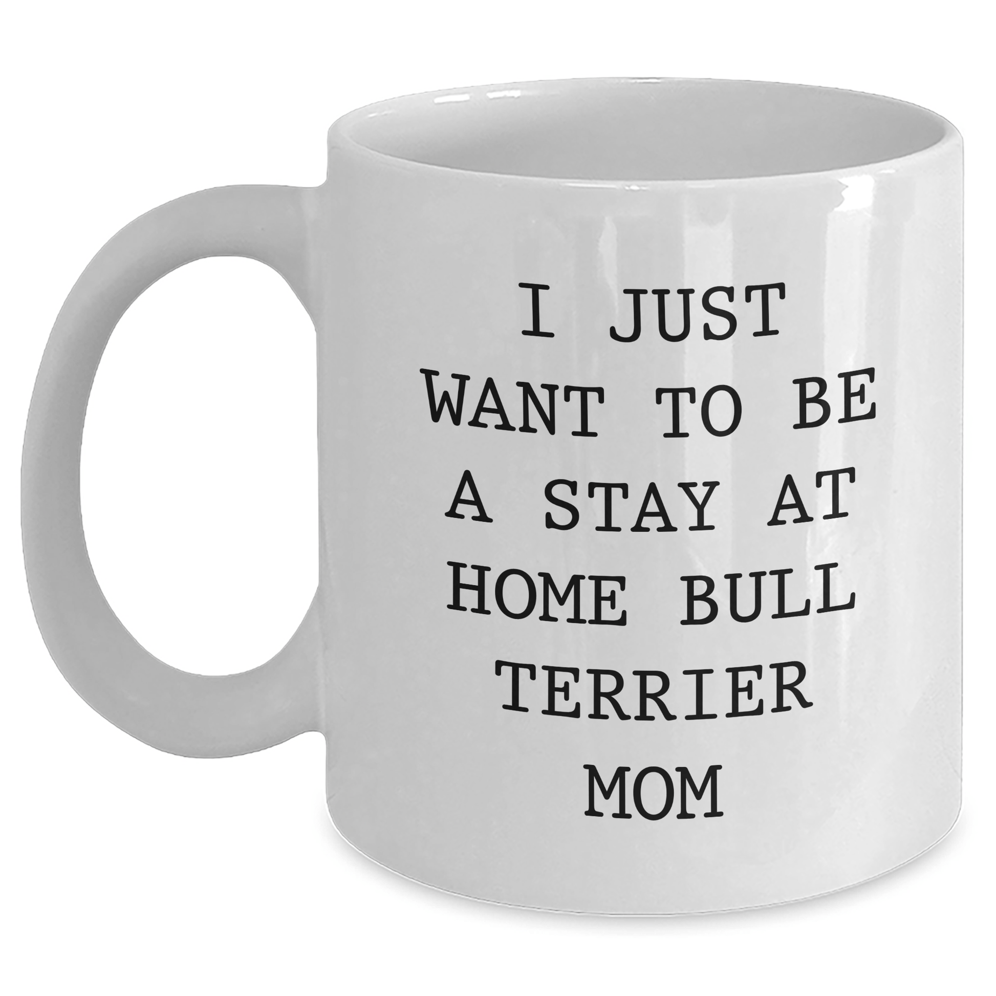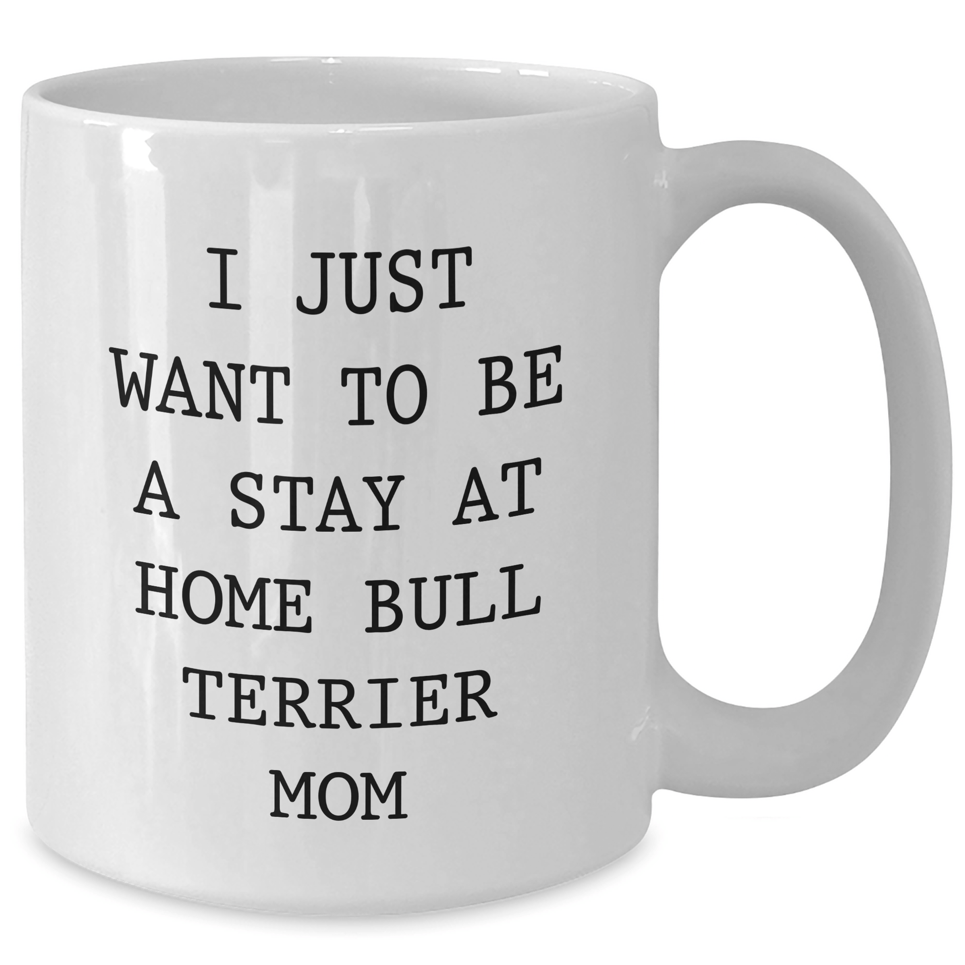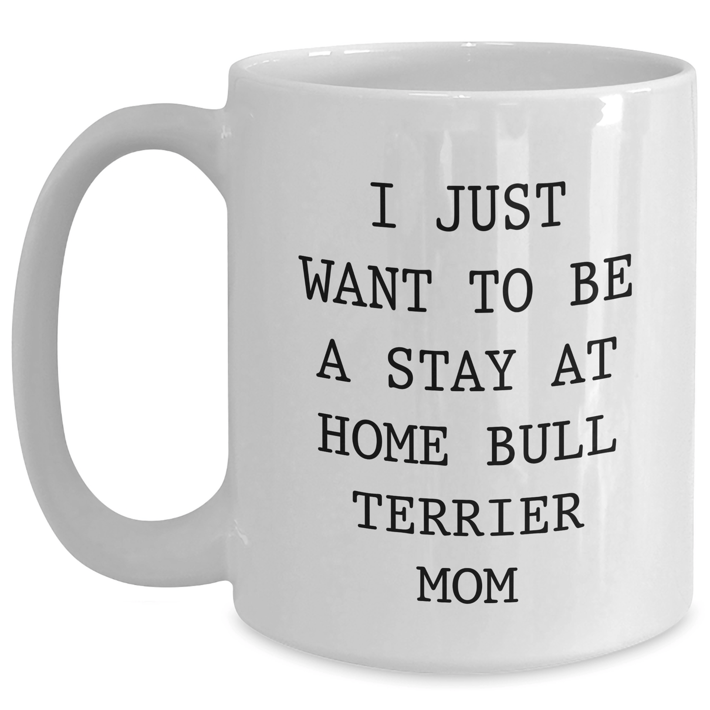 Are you a Bull Terrier Dog enthusiast looking for a unique gift for your favorite Bull Terrier Dog dad? Look no further! This funny quote on a white coffee mug is the perfect way to express your love and appreciation for your furry friend. The quote 'I Just Want To Be A Stay At Home Bull Terrier Mom' is a heartwarming and humorous way to show your dad that you care. The mug is made from high-quality ceramic and is safe for microwave and dishwasher use. It's the ideal gift for Father's Day or any special occasion.