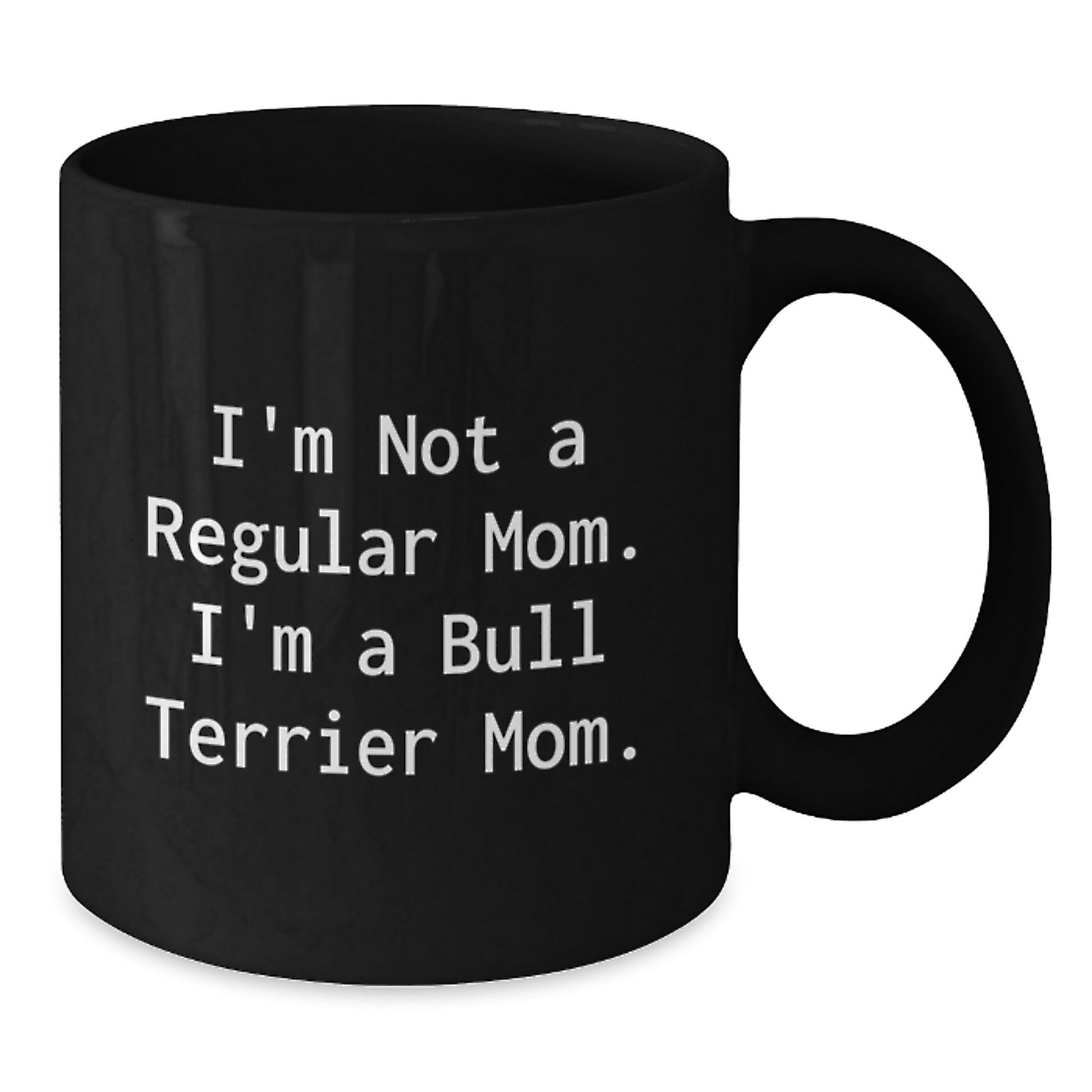 Are you a proud Bull Terrier Dog parent? Do you want to show off your love for your furry friend? Look no further! This unique Black Coffee Mug is the ideal gift for any Bull Terrier Dog enthusiast. With its funny quote, 'I'm Not A Regular Mom. I'm A Bull Terrier Mom.', this mug is sure to bring a smile to the face of your loved one. Whether it's a graduation gift or just a random act of kindness, this mug is the perfect way to express your gratitude and love.