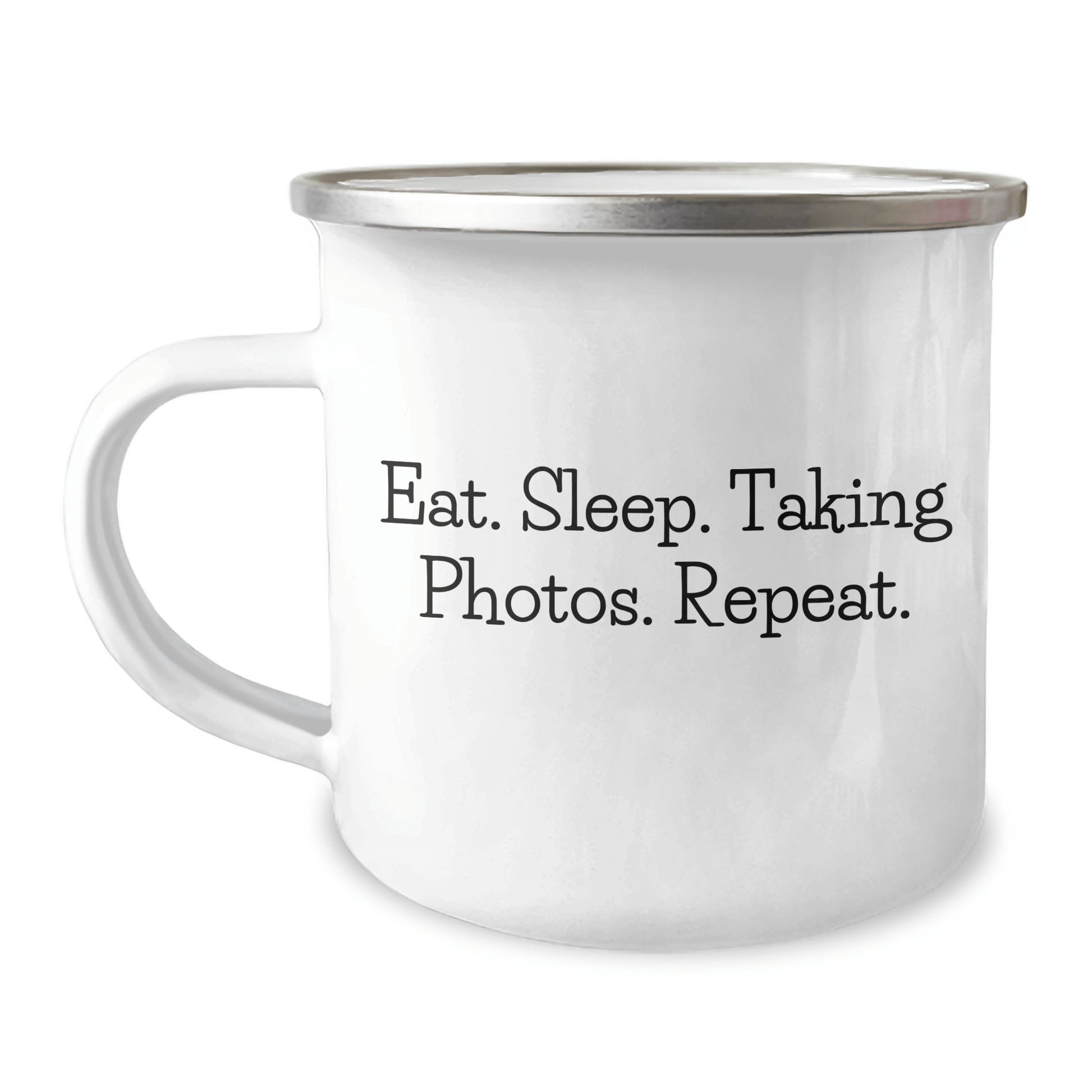 If you know someone who loves taking photos, this funny camping mug is the ideal gift for them. The quote 'Eat. Sleep. Taking Photos. Repeat.' is a great reminder of their passion for photography. This stainless steel mug with enamel finish is sturdy and easy to clean. Hand washing with mild detergent is recommended. The permanent printing won't fade after washing. Give this unique gift to your friends, family, or coworkers who love taking photos. It's a great way to show your appreciation for their hobby. This camping mug is perfect for Father's Day, birthdays, or any other special occasion. So, get this funny camping mug and make someone's day!