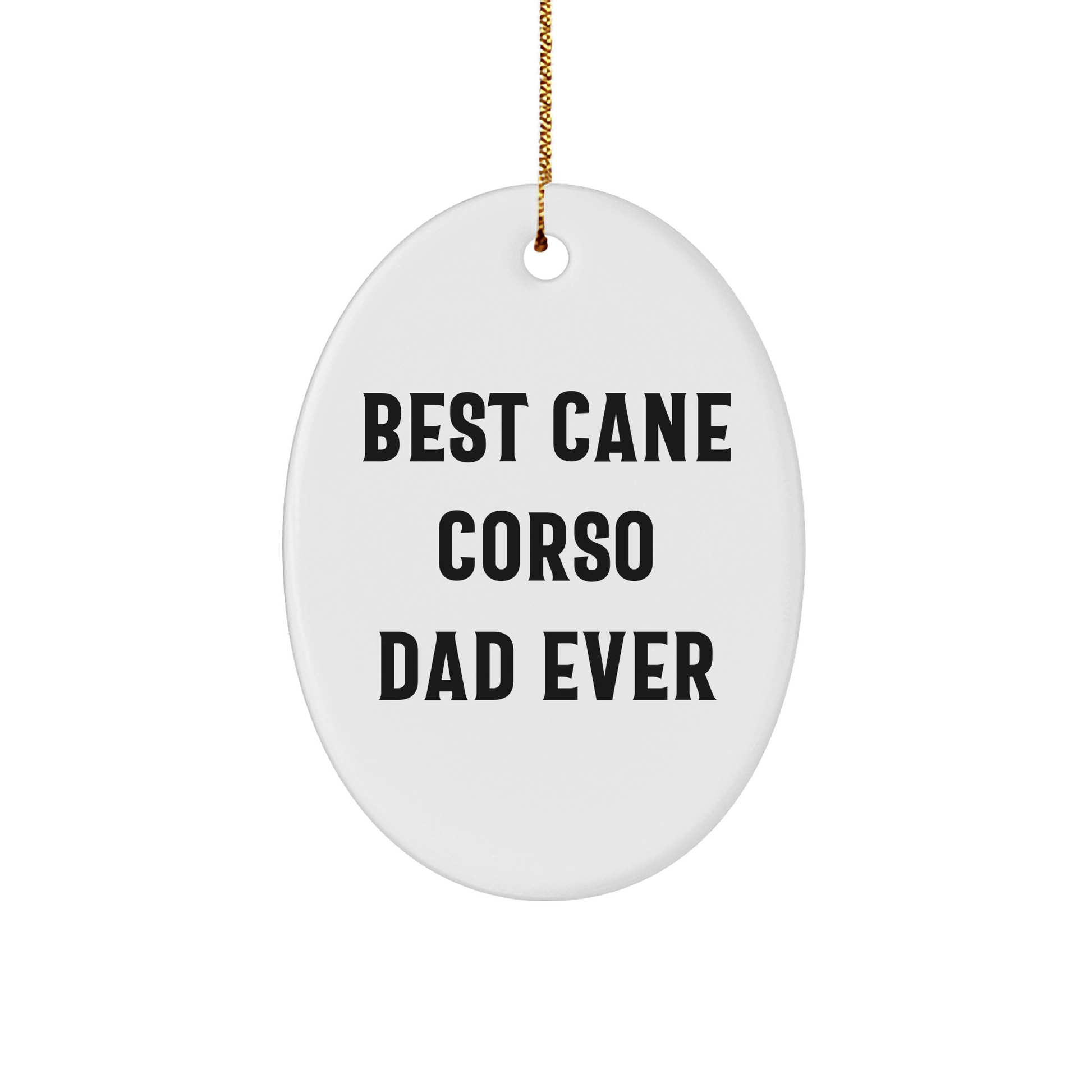 Get ready to delight any Cane Corso Dog enthusiast with this hilarious 'Best Cane Corso Dad Ever' Oval Ornament! Perfect for decorating your home or giving as a thoughtful gift to friends, family, or coworkers. This vibrant ornament is crafted from sturdy MDF with a high-gloss finish and features a funny quote that's sure to bring a smile. The perfect addition to any Cane Corso Dog lover's Christmas decor, this ornament is lightweight and resistant to breaking, making it a great choice for households with children or pets. So why wait? Order this unique gift today and show off your love for Cane Corso Dogs!