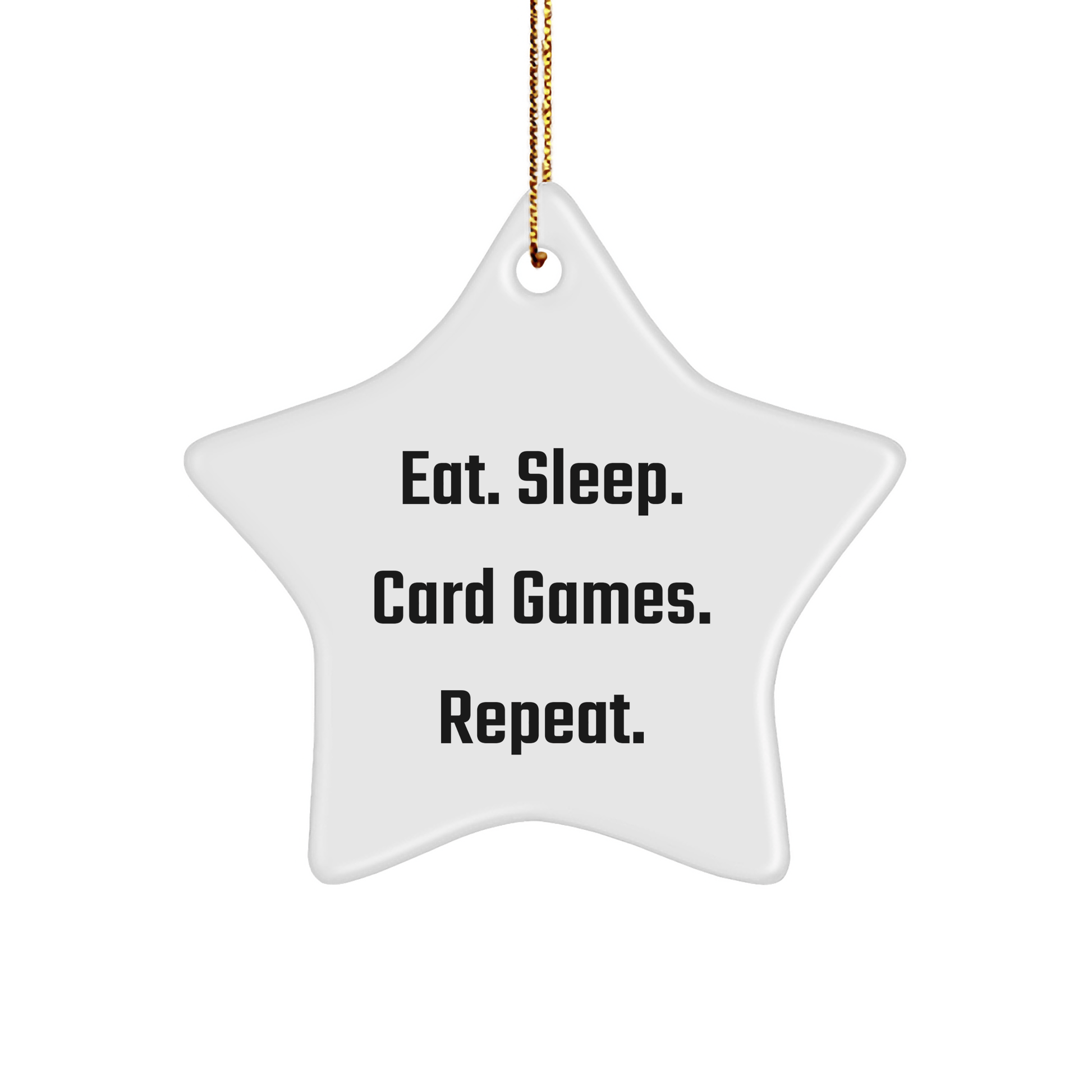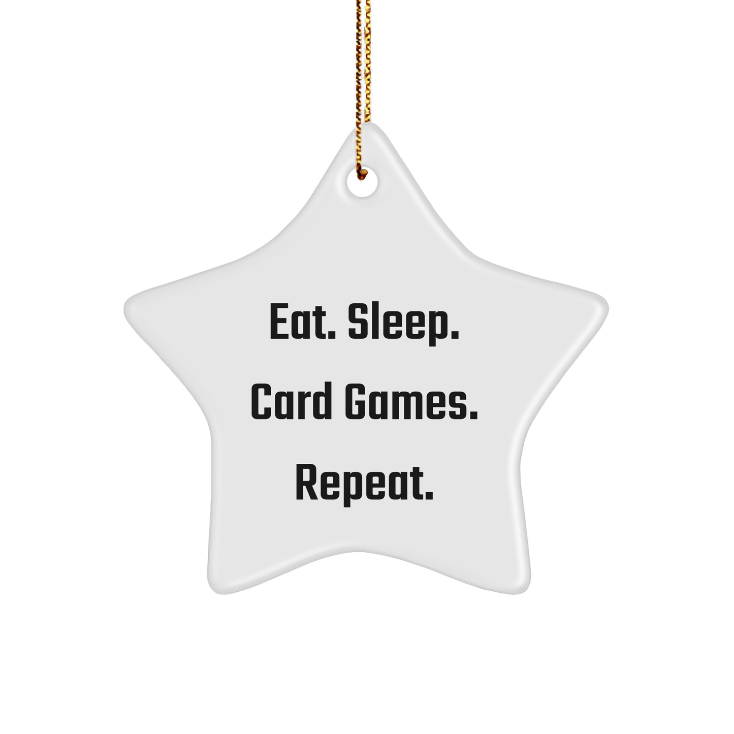 - Elevate your Card Games experience with this unique 'Eat. Sleep. Card Games. Repeat.' star ornament, perfectly capturing the essence of your favorite hobby. With its vibrant colors and eye-catching design, this decorative piece is sure to spark conversations and inspire nostalgic memories.