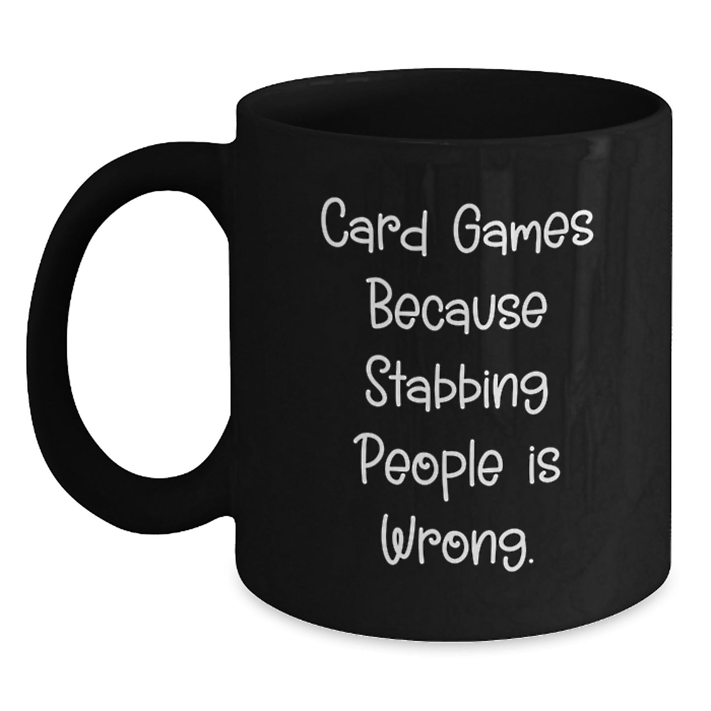 Are you a card game enthusiast or looking for a unique gift for the graduation season? Look no further! Our funny black coffee mug is the perfect way to celebrate this special occasion with a quirky quote that's sure to bring a smile to the recipient's face. 'Card Games Because Stabbing People Is Wrong.' is a humorous take on the popular card games we all love to play.