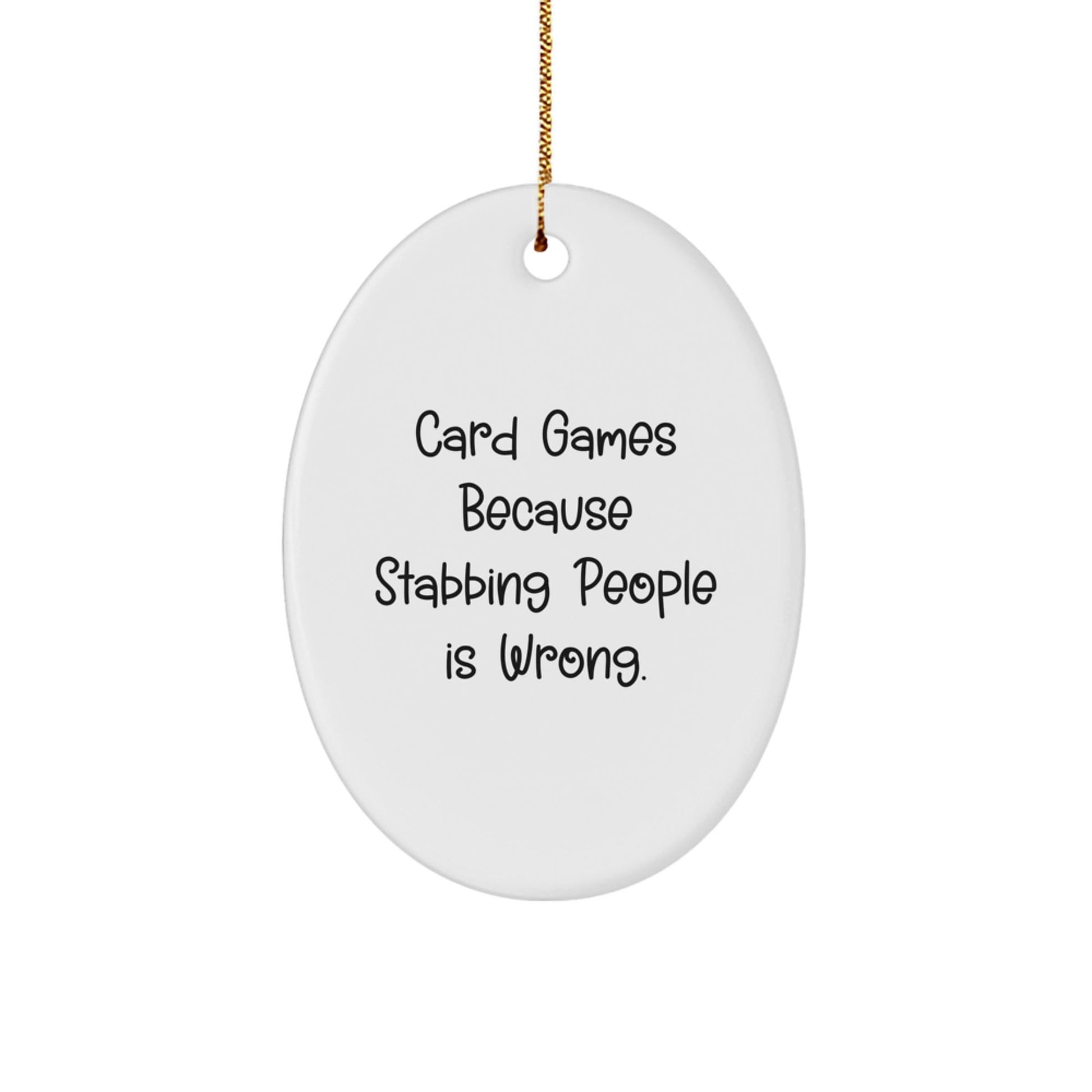 - Add a touch of humor to your card game collection with this funny Oval Ornament featuring the quote 'Card Games Because Stabbing People Is Wrong.'.