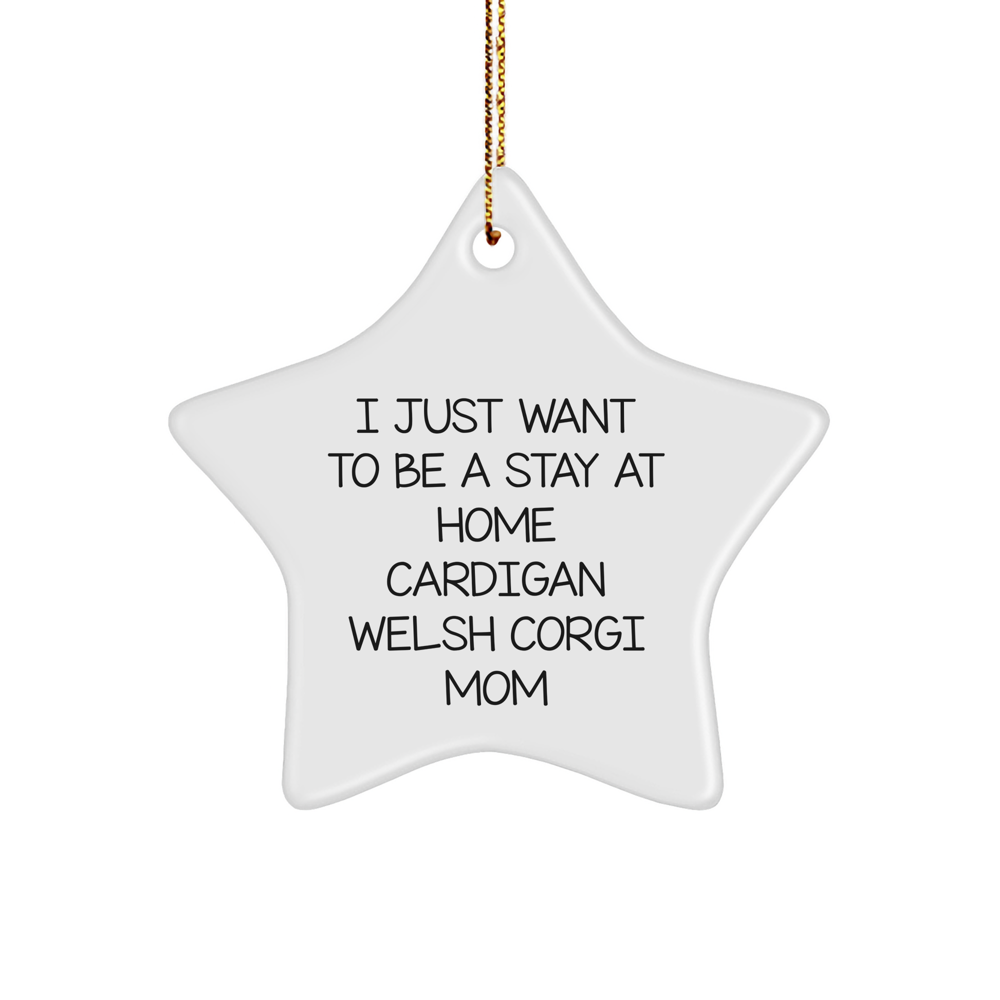 Are you a Cardigan Welsh Corgi Dog enthusiast or looking for a unique gift for your favorite Corgi Mom? This 'I Just Want To Be A Stay At Home Cardigan Welsh Corgi Mom' Star Ornament is a thoughtful and humorous way to show your love and appreciation. Made from sturdy MDF with a high-gloss plastic finish, this star-shaped ornament is vibrantly printed from edge-to-edge via Sublimation, ensuring bright and vivid colors. Lightweight and resistant to breaking, it's a great choice for households with children or pets. The festive gold cord makes it easy to hang, perfect for stress-free decorating. Whether you're a Cardigan Welsh Corgi Dog mom or just a fan, this ornament is a heartwarming addition to your holiday decorations. Gift it to your loved ones and spread the joy of the season!