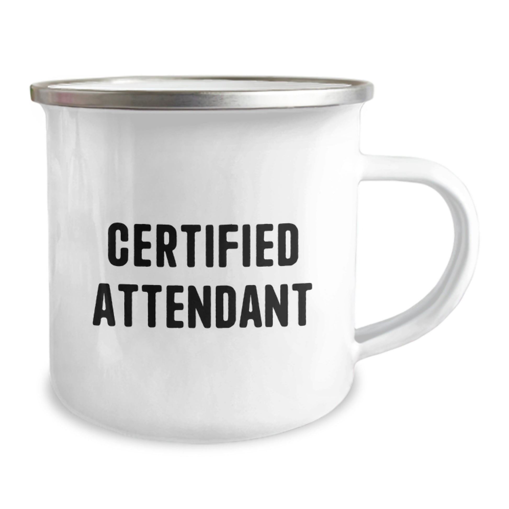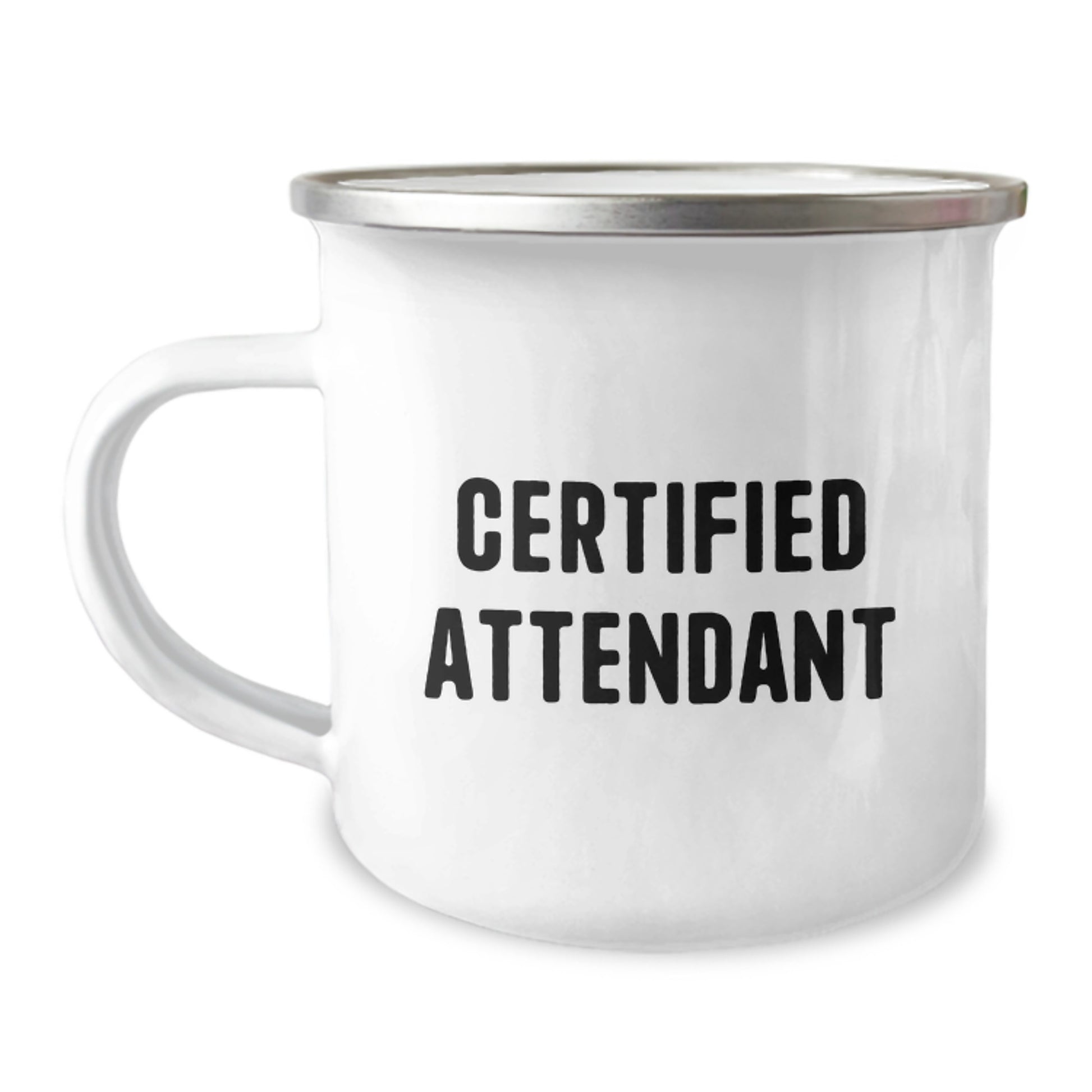 - Make sure to add this 'Certified Attendant' 12 oz stainless steel camping mug to your outdoor gear collection today, and get ready to enjoy your favorite beverages in comfort and style while camping, hiking, or just relaxing in your backyard. With its durable construction, vibrant design, and convenient 12 oz capacity, this camping mug is sure to become your new favorite companion for any outdoor adventure.