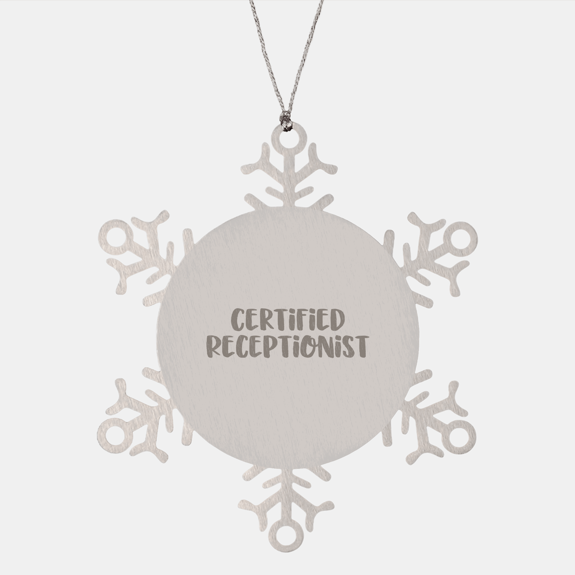 - Make a lasting impression on your receptionist with this beautiful 'Certified Receptionist' Snowflake Ornament, crafted from premium stainless steel for added durability and safety, measuring 3.14 inches in diameter, making it a unique and thoughtful gift for the holiday season.