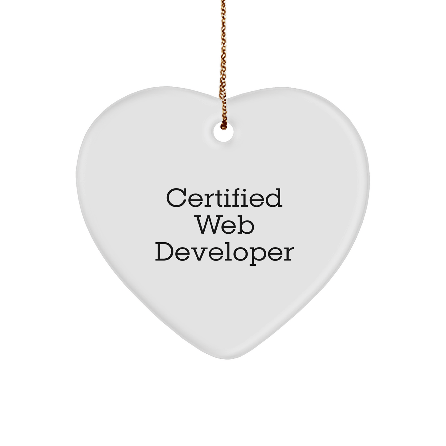 - Experience the perfect blend of technology and tradition with this 'Certified Web Developer' designed Heart Ornament, crafted from durable MDF with a high-gloss plastic finish for long-lasting designs, making it a unique gift for any web developer or tech enthusiast.