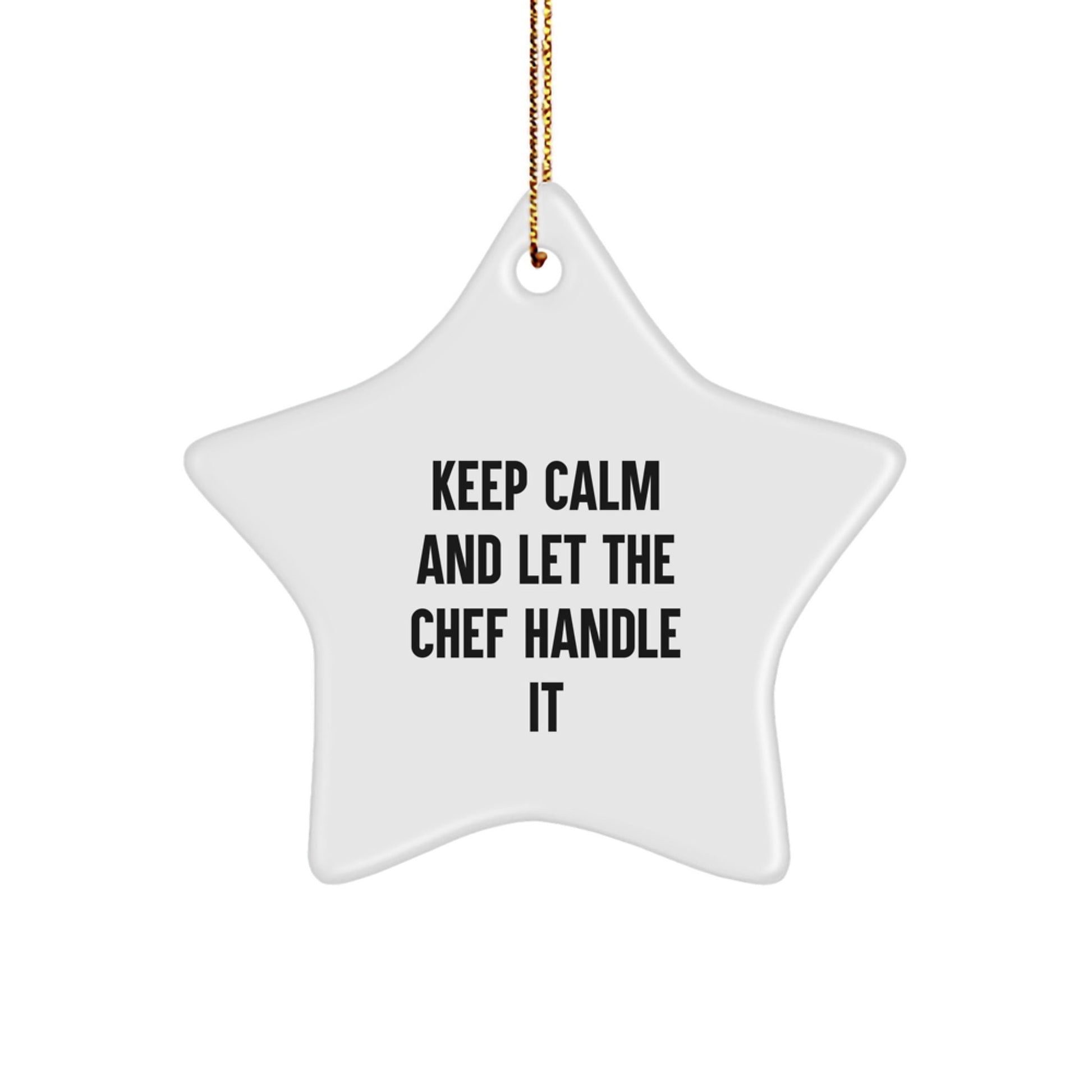 This Star Ornament is a thoughtful way to show your appreciation for the chefs in your life, whether it's a family member, friend, or coworker. It's a unique and humorous gift that's sure to be cherished for years to come. So why wait? Order your 'Keep Calm And Let The Chef Handle It' Star Ornament today and make this Christmas one to remember!