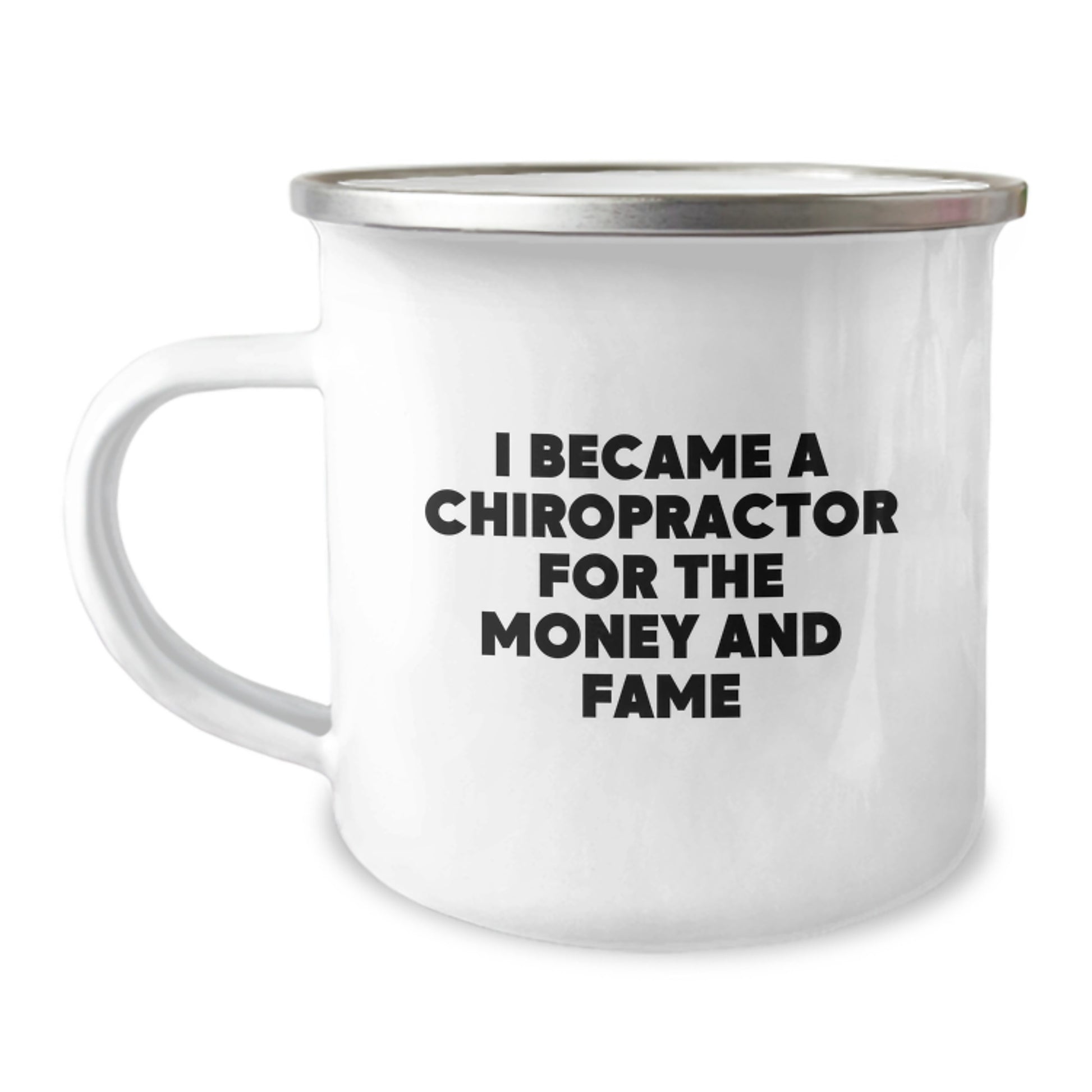 • This funny Camping Mug is a great way to show off your sense of humor and appreciation for the Chiropractor in your life. Made of high-quality stainless steel with an enamel finish, this mug is sturdy and easy to clean. The 'I Became A Chiropractor For The Money And Fame' design is a humorous take on the realities of being a Chiropractor, and is sure to bring a smile to anyone's face.