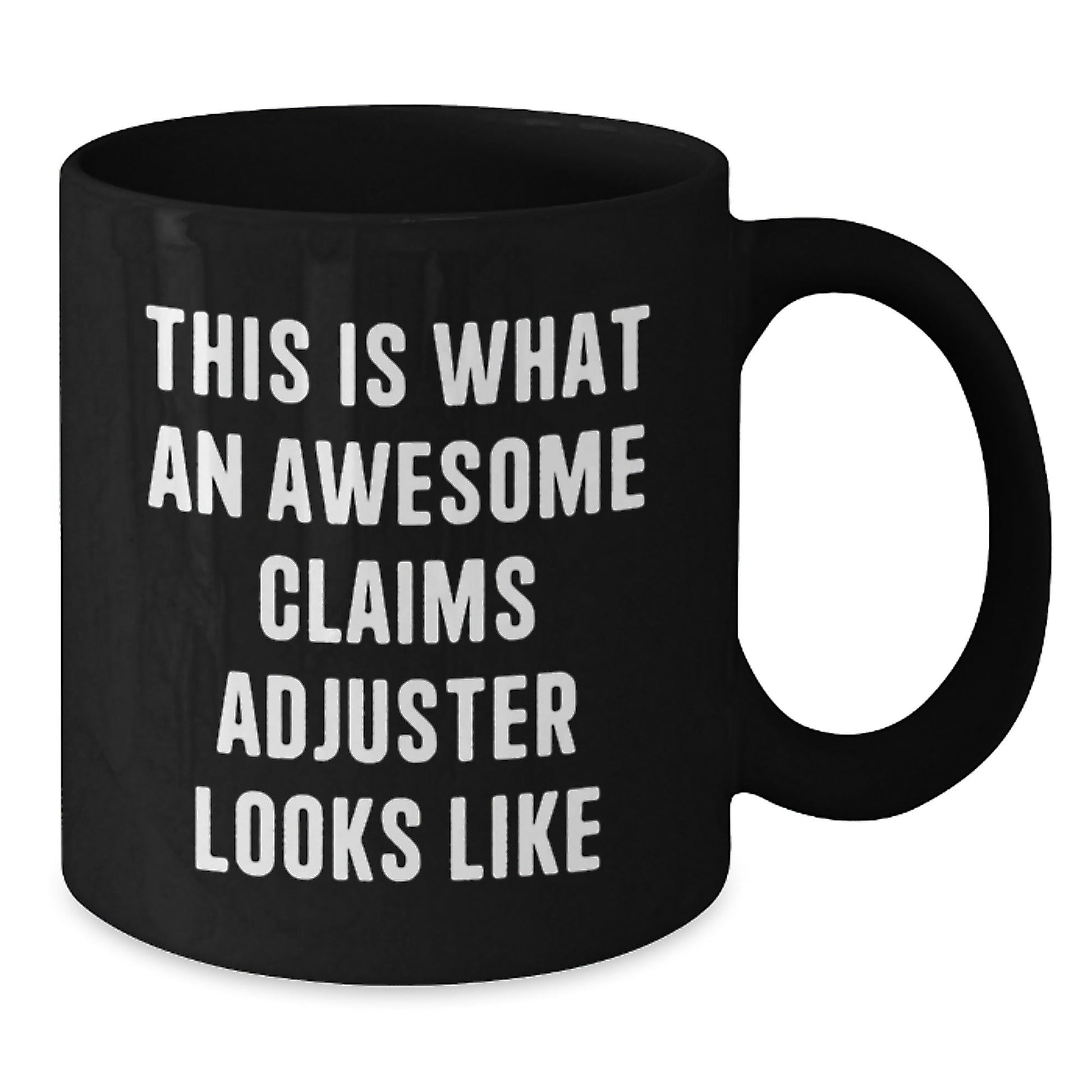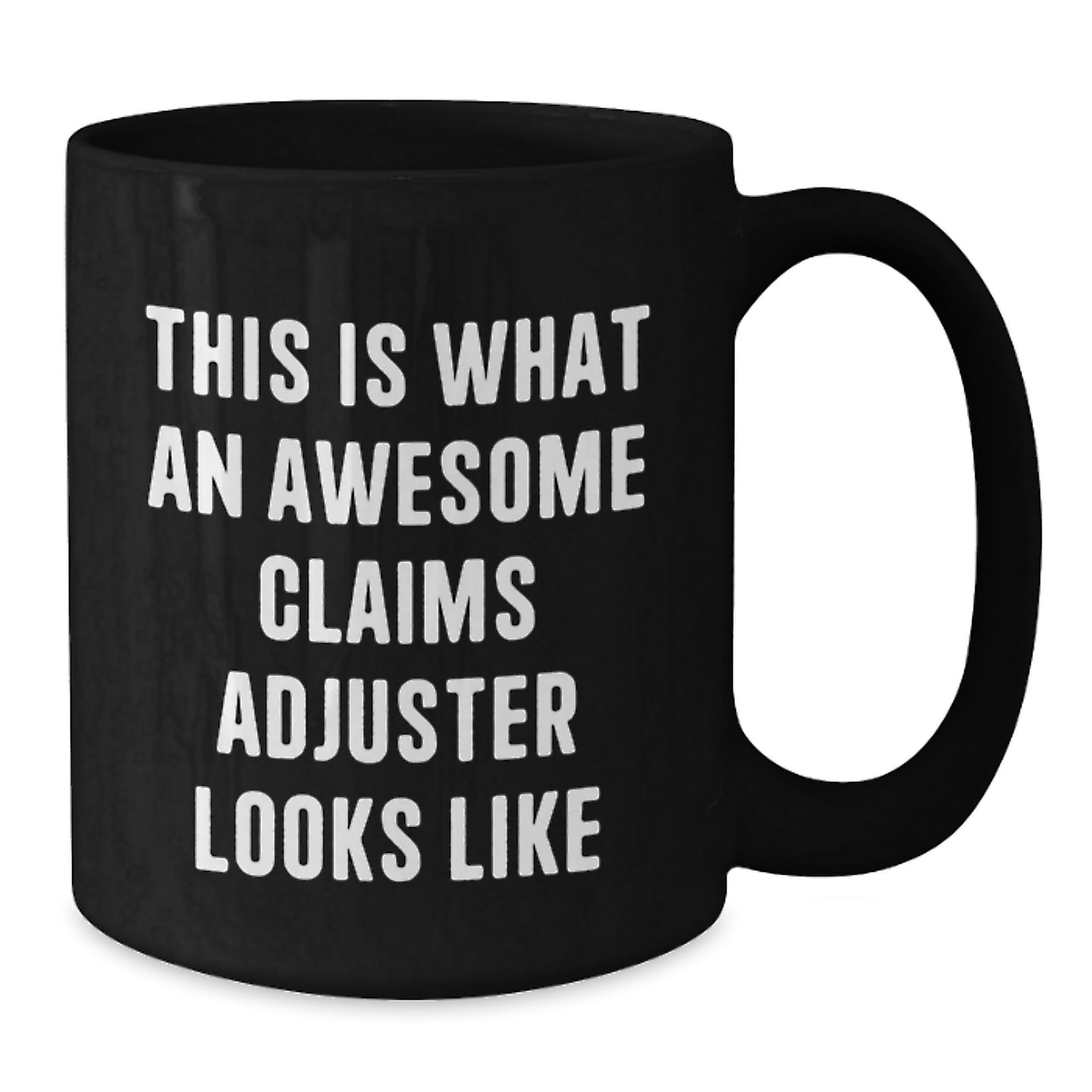 - This funny black coffee mug is the perfect way to show your appreciation for the Claims Adjuster in your life, featuring the quote 'This Is What An Awesome Claims Adjuster Looks Like', which is sure to bring a smile to their face.