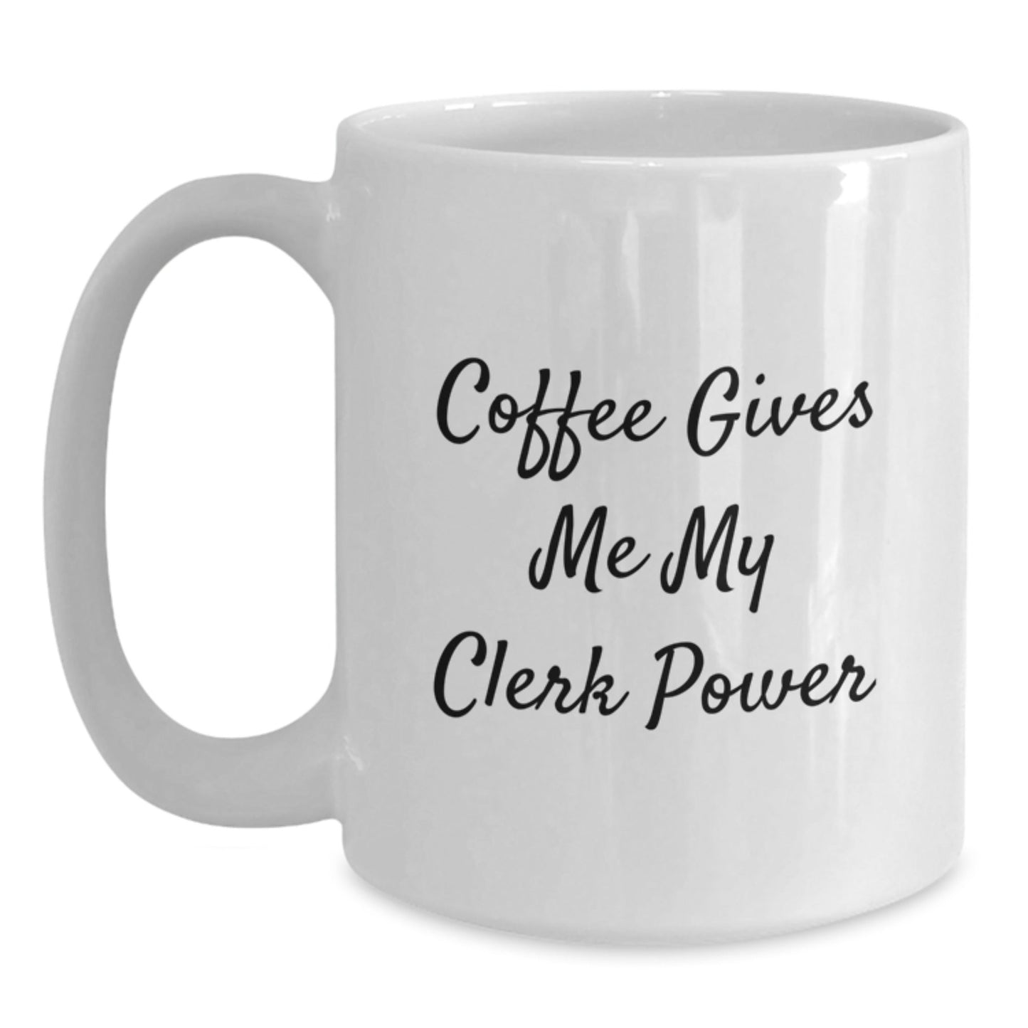 - Order your 'Coffee Gives Me My Clerk Power' mug today and make someone's day a little brighter!