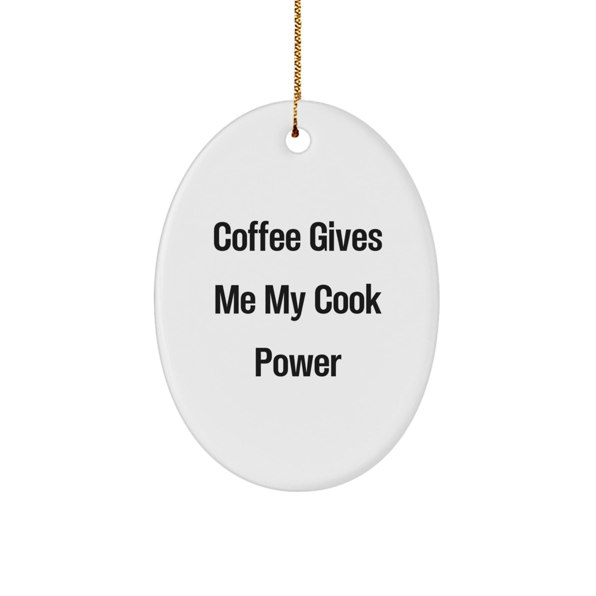 - This oval ornament is a funny and thoughtful gift for the cook in your life, featuring the quote 'Coffee Gives Me My Cook Power' that will resonate with any coffee lover.