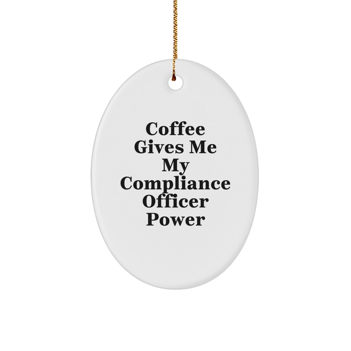 - Add a touch of personality to your office or home with this Oval Ornament, featuring the quote 'Coffee Gives Me My Compliance Officer Power'. This is a unique and thoughtful gift for compliance officers who appreciate a good cup of coffee.