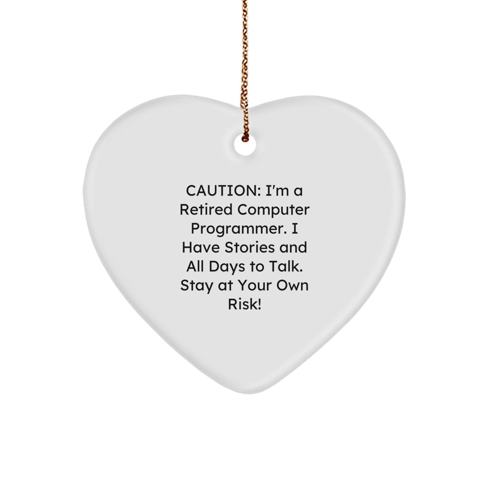 Are you a computer programmer or a tech enthusiast looking for a unique gift for your friends, family, or coworkers? Look no further! This funny 'Caution: I'm A Retired Computer Programmer...' heart ornament is the perfect way to show your appreciation for their hard work and dedication. Crafted from sturdy MDF with a high-gloss plastic finish, this ornament is lightweight, resistant to breaking, and easy to hang. It's the ideal gift for any occasion, especially Christmas. Imagine the smile on their face when they see this hilarious heart ornament on their desk or mantle. Give the gift of laughter and joy this holiday season!