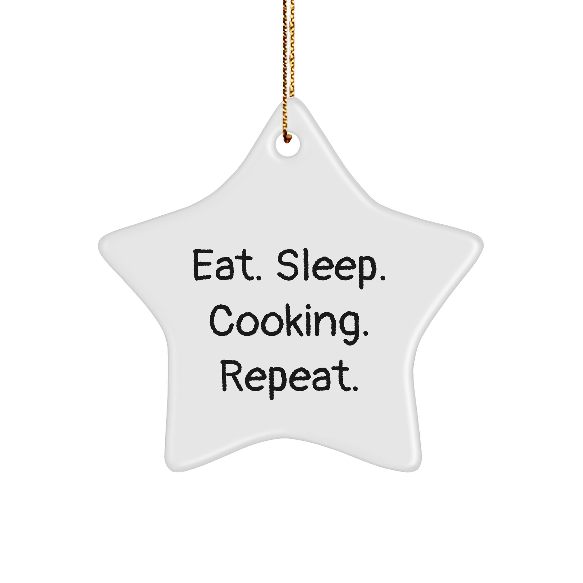 - This 'Eat. Sleep. Cooking. Repeat.' Star Ornament is a thoughtful gift for friends who love cooking, making it a great addition to any kitchen.