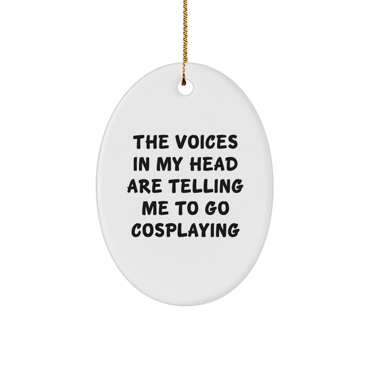 - Our 'The Voices In My Head Are Telling Me To Go Cosplaying' Oval Ornament is a unique and thoughtful gift for any cosplaying enthusiast or Christmas decoration lover. It's made from sturdy MDF with a high-gloss plastic finish, ensuring it will last for years to come.
