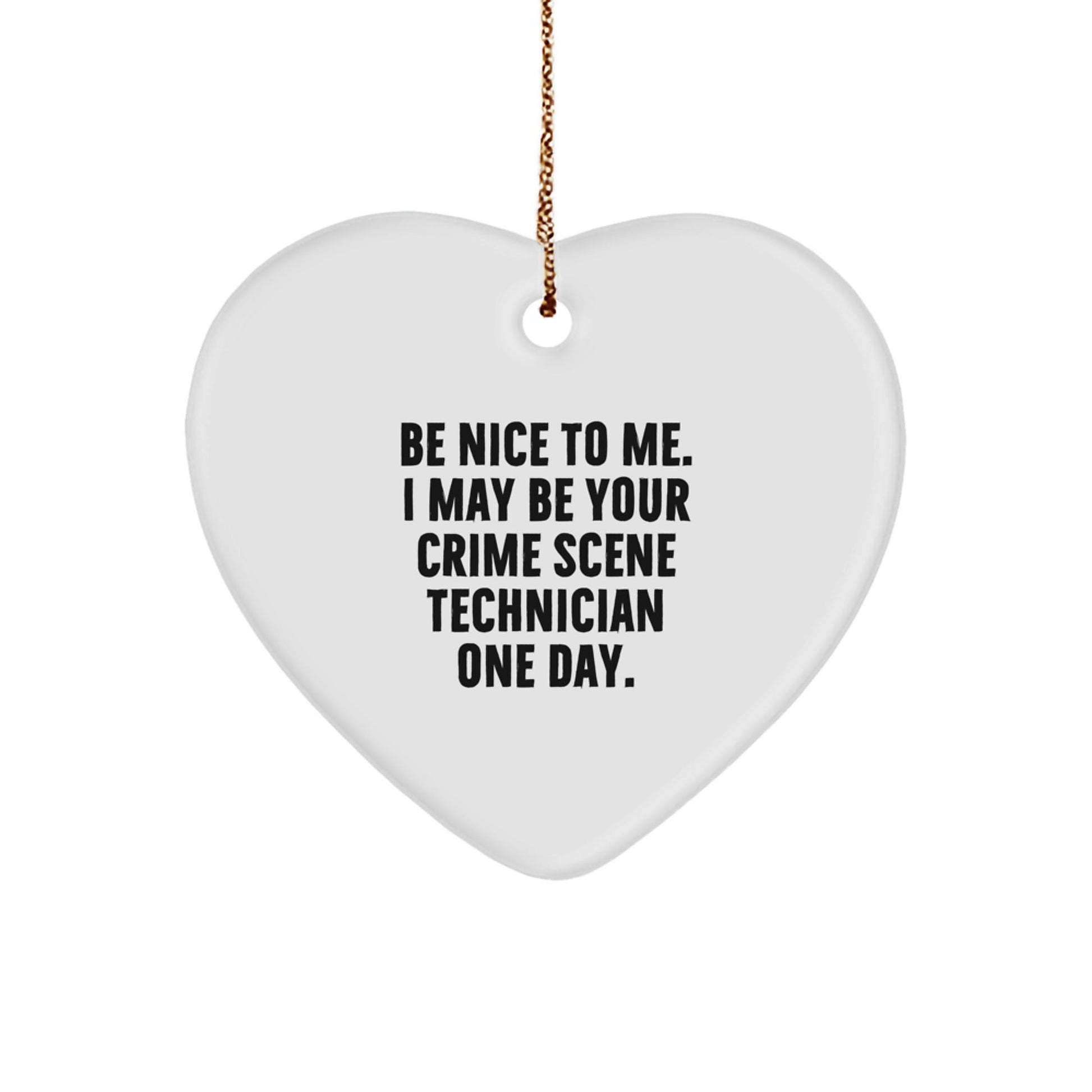 - The quote 'Be Nice To Me. I May Be Your Crime Scene Technician One Day.' adds a touch of humor and personality to the ornament. It's a great way to show your appreciation for the hard work and dedication of crime scene technicians.