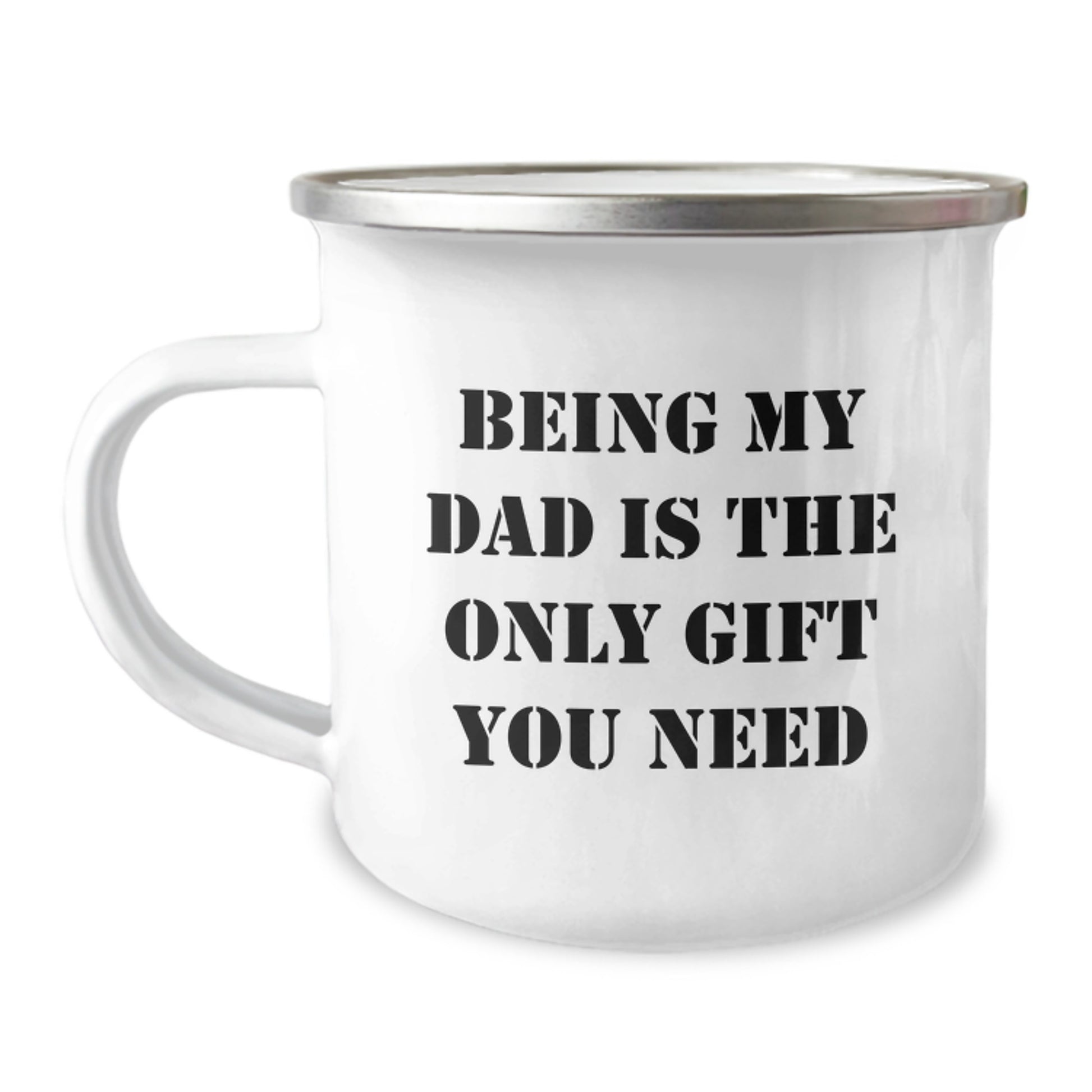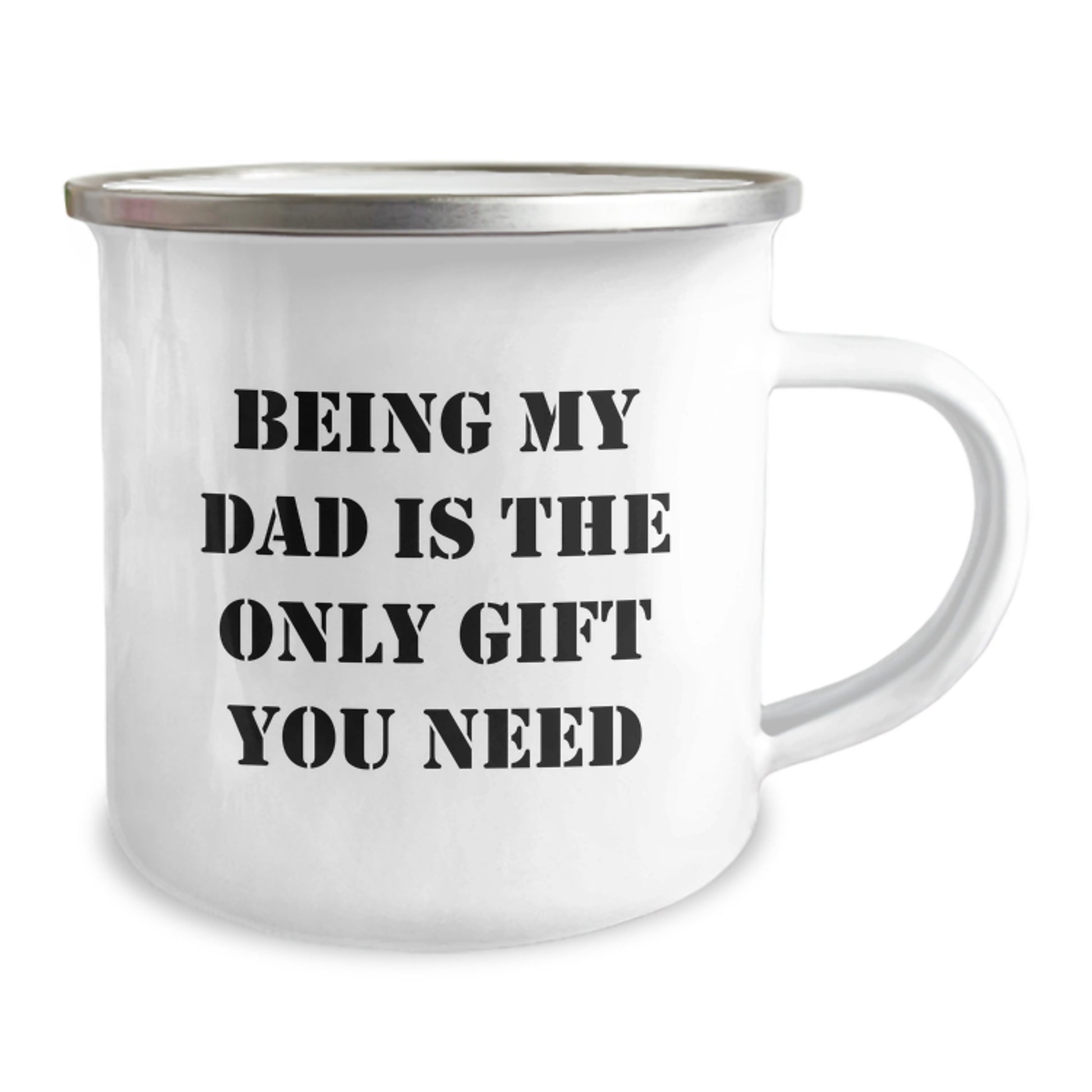 Are you struggling to find the ideal gift for your dad? Look no further! This funny quote, 'Being My Dad Is The Only Gift You Need', is the perfect present for any dad who loves the outdoors. Our camping mug is made of high-quality stainless steel with an enamel finish, ensuring it's both sturdy and easy to clean. Plus, it's the perfect size for a warm cup of coffee or tea on a chilly morning. Whether you're a dad yourself or looking for a gift for a special dad in your life, this camping mug is sure to bring a smile to his face. So why wait? Treat your dad to a unique and thoughtful gift that he'll cherish for years to come.