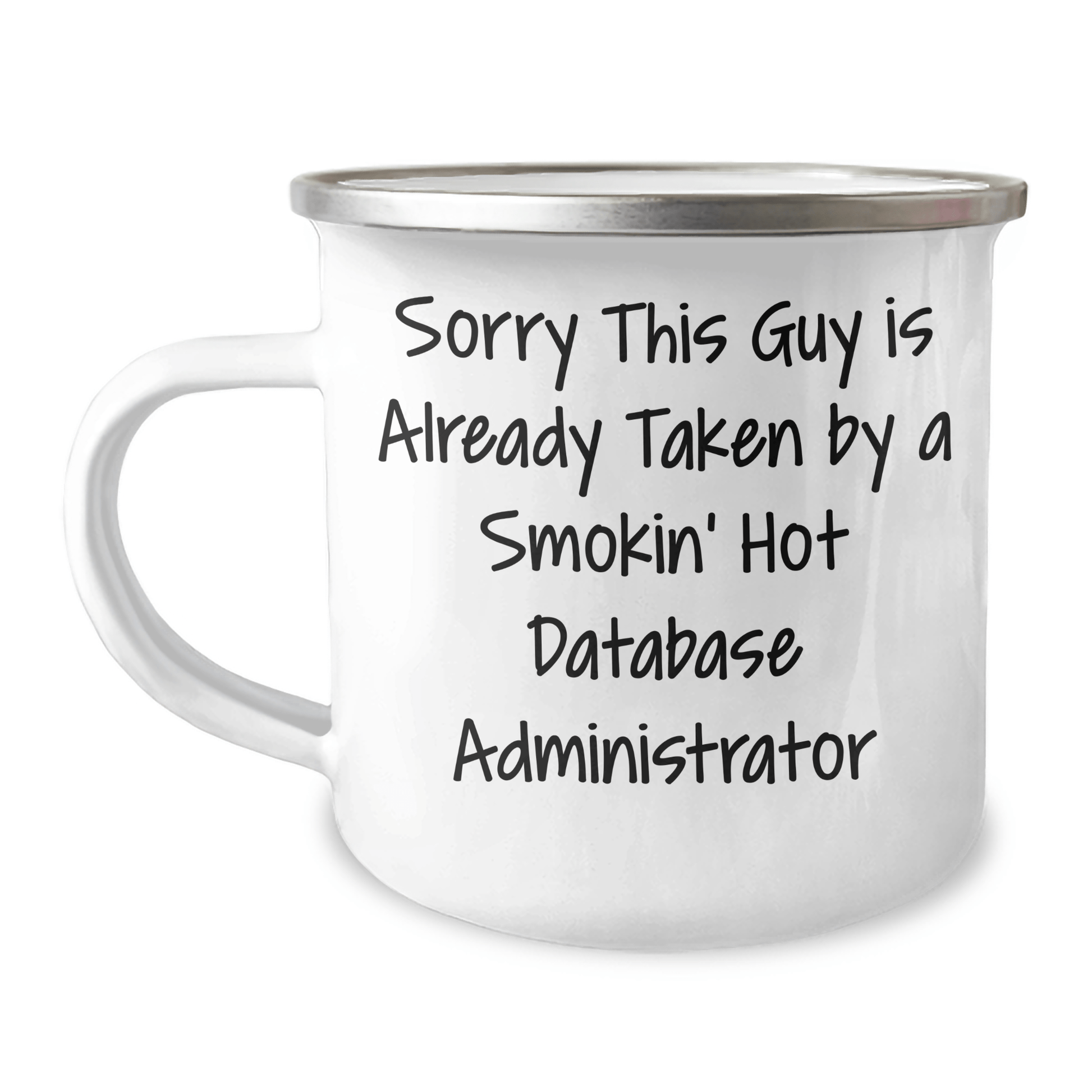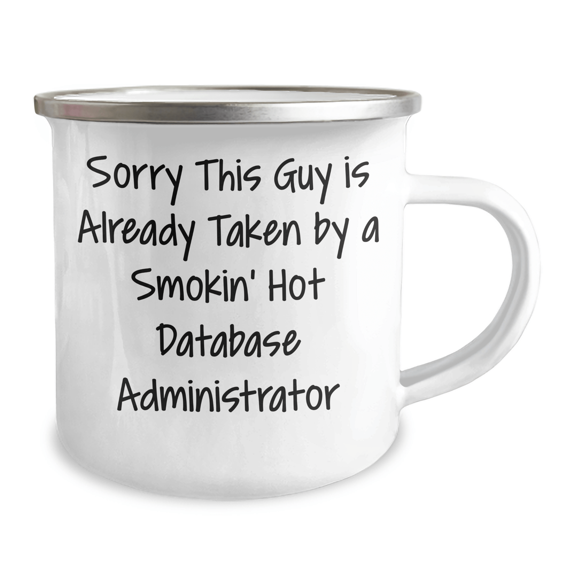 - This funny quote mug is a unique and humorous way to show your appreciation for your Database Administrator friend or family member's hard work and dedication. It's a great gift for Father's Day, and it's sure to bring a smile to their face. The quote 'Sorry This Guy Is Already Taken By A Smokin' Hot Database Administrator' is a humorous way to poke fun at the stereotype of Database Administrators being always in demand.
