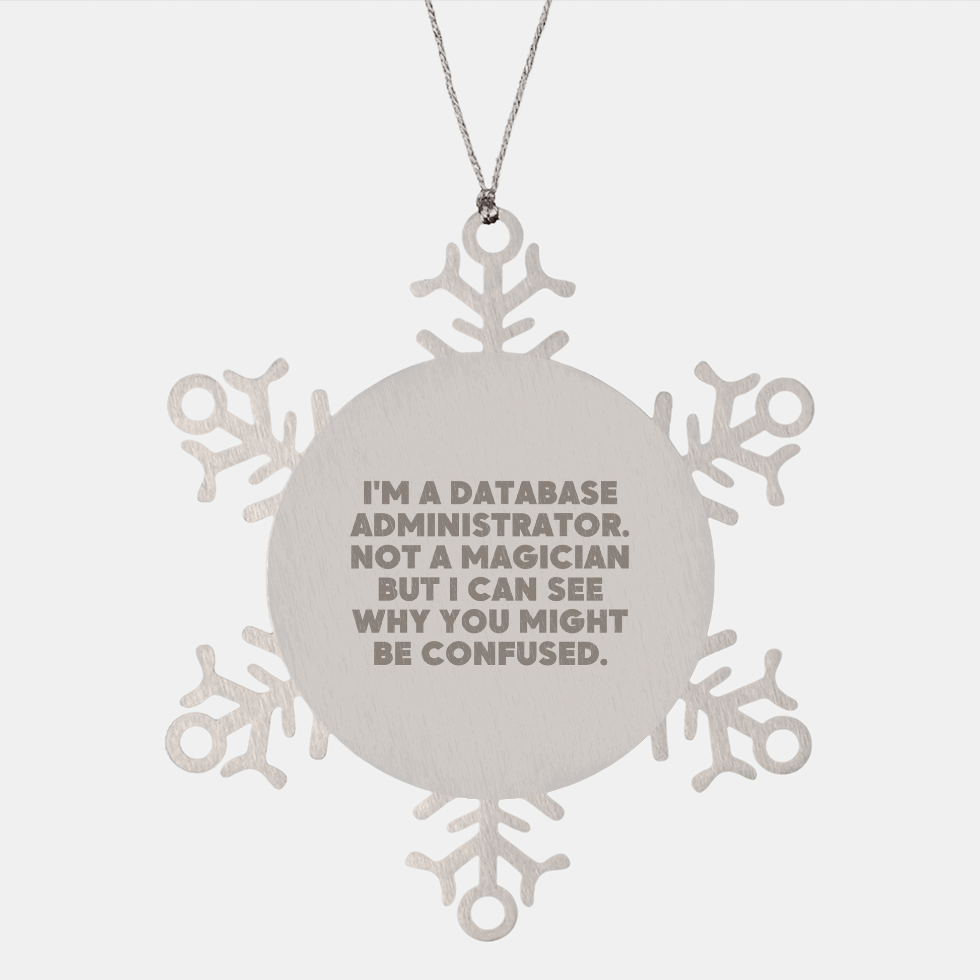 Are you a Database Administrator looking for a unique gift or a friend or family member seeking a thoughtful present for a fellow Database Administrator? Look no further! Our funny quote Snowflake Ornament is the ideal gift for Christmas. Crafted from premium stainless steel, this shatterproof ornament measures 3.14 inches in diameter and ensures durability and safety. As a Database Administrator, you know how important it is to have a sense of humor, and this quote will bring a smile to your face: 'I'm A Database Administrator. Not A Magician But I Can See Why You Might Be Confused.' Perfect for hanging on your office door or giving as a gift, this Snowflake Ornament is a thoughtful and humorous way to celebrate the holiday season. Whether you're a Database Administrator yourself or know someone who is, this gift is sure to delight. So why wait? Order your Snowflake Ornament today and make this Christmas one to remember!
