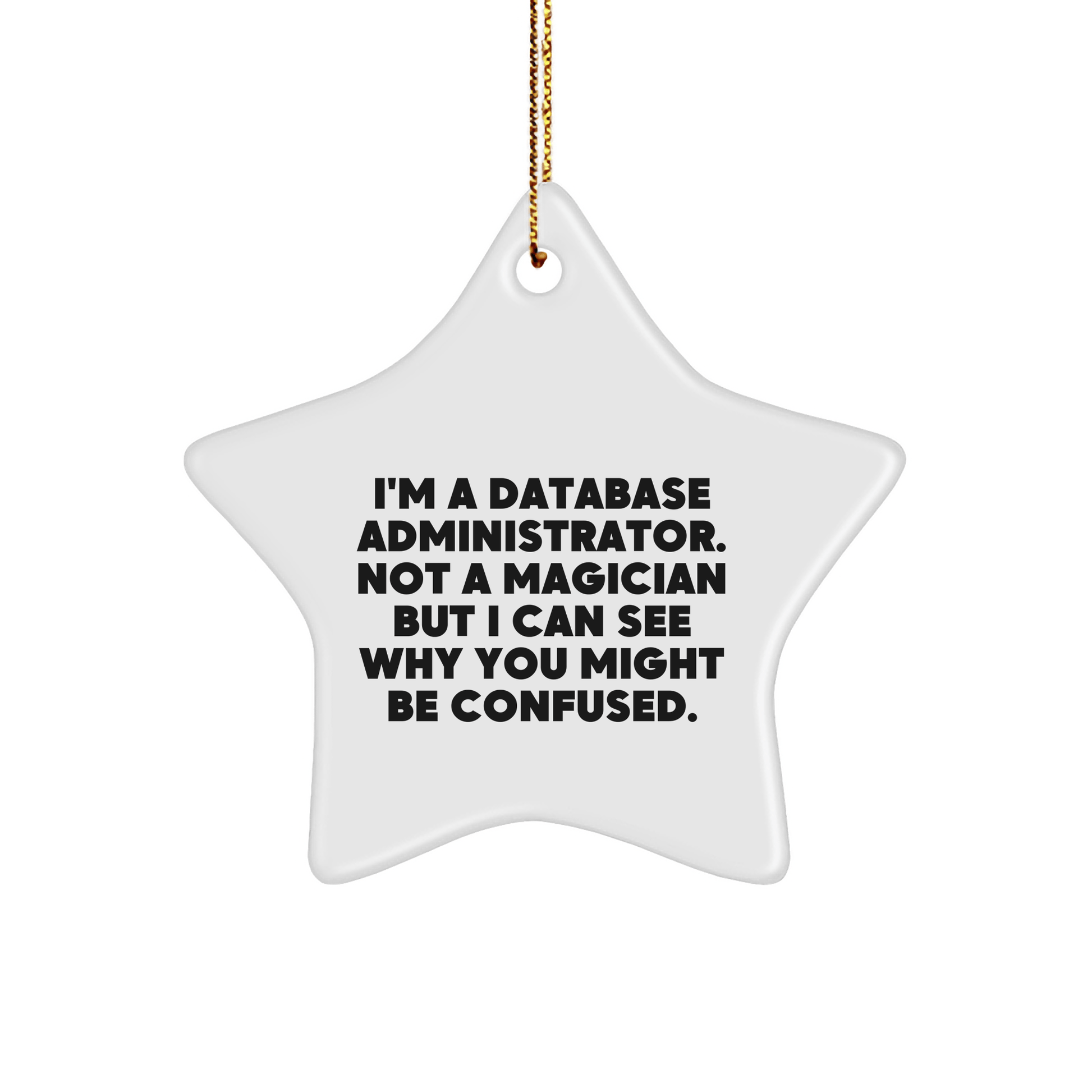 Are you a Database Administrator or know someone who is? This funny quote star ornament is the ideal gift to bring a smile to their face. 'I'm A Database Administrator. Not A Magician But I Can See Why You Might Be Confused.'