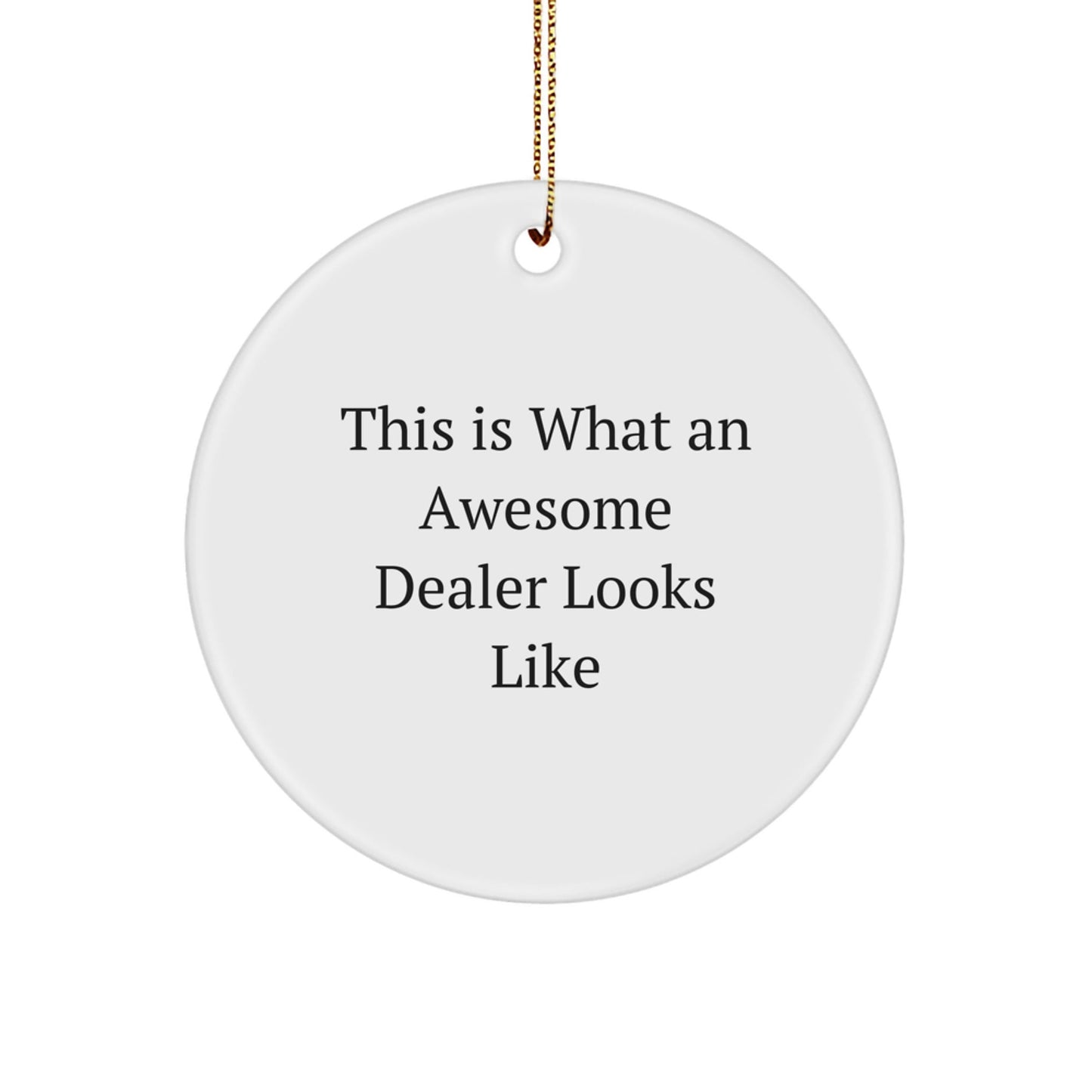 - Make a thoughtful and personalized gift for dealers with this unique Circle Ornament, featuring the quote 'This Is What An Awesome Dealer Looks Like'.