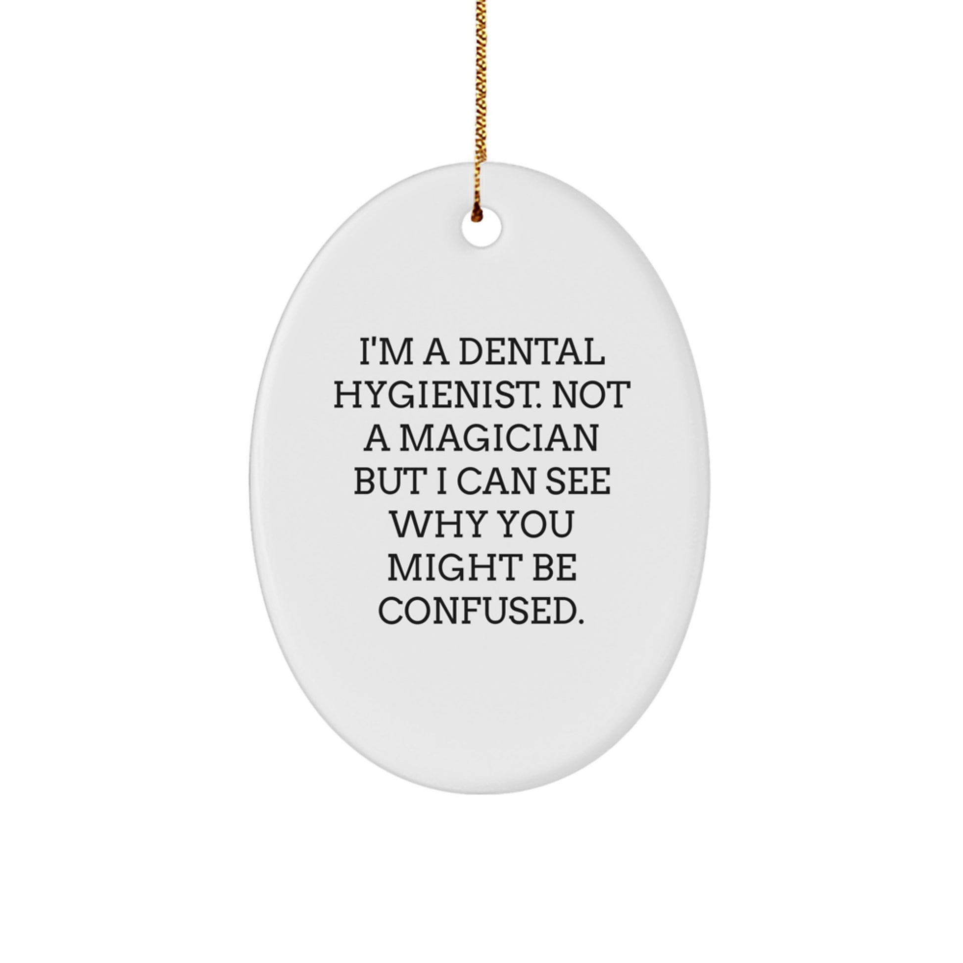 Look no further! Our 'I'm A Dental Hygienist. Not A Magician But I Can See Why You Might Be Confused.' Oval Ornament is the perfect way to showcase your pride in your profession. The quote is sure to bring a smile to the face of any Dental Hygienist and is a great conversation starter for the holiday season.