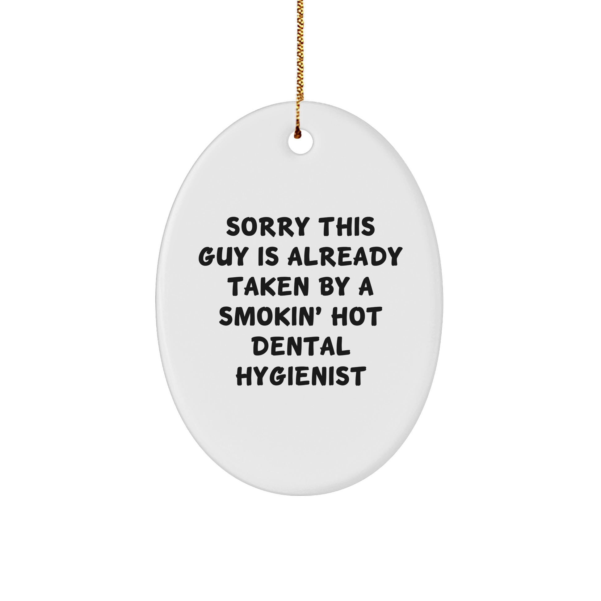 If you're looking for a unique gift for the dental hygienist in your life, look no further! This adorable oval ornament is a funny way to show your appreciation for their hard work. Sorry This Guy Is Already Taken By A Smokin' Hot Dental Hygienist is a hilarious quote that's sure to bring a smile to their face. Made from sturdy MDF with a high-gloss plastic finish, this ornament is vibrantly printed from edge-to-edge via Sublimation, ensuring bright and vivid colors. It's lightweight and resistant to breaking, making it a great choice for households with children or pets. The festive gold cord makes it easy to hang, perfect for stress-free decorating. Whether you're a friend, coworker, or family member, this ornament is a thoughtful gift for any dental hygienist. So why not show your appreciation this Christmas with a funny and unique gift?