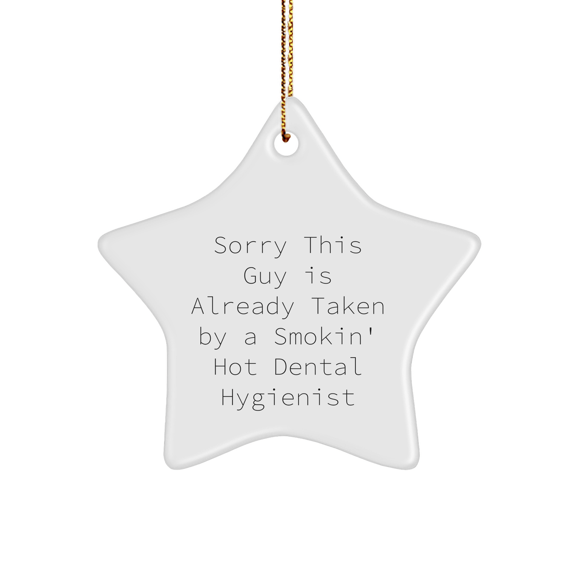 So don't wait any longer, order your 'Sorry This Guy Is Already Taken By A Smokin' Hot Dental Hygienist' Star Ornament today and make this Christmas one to remember!