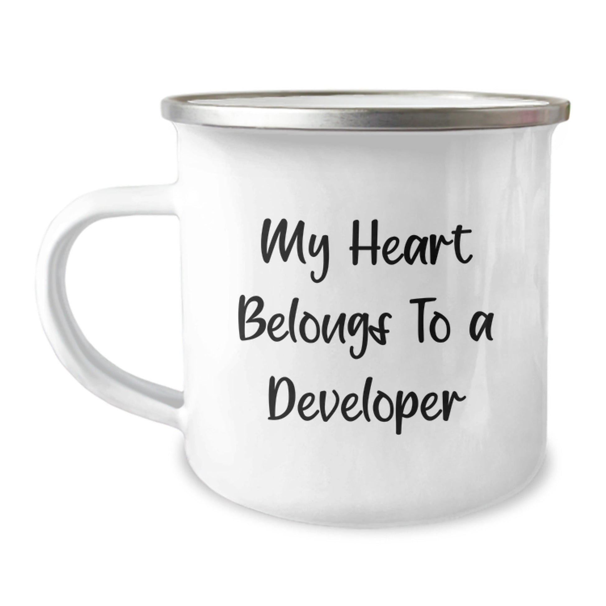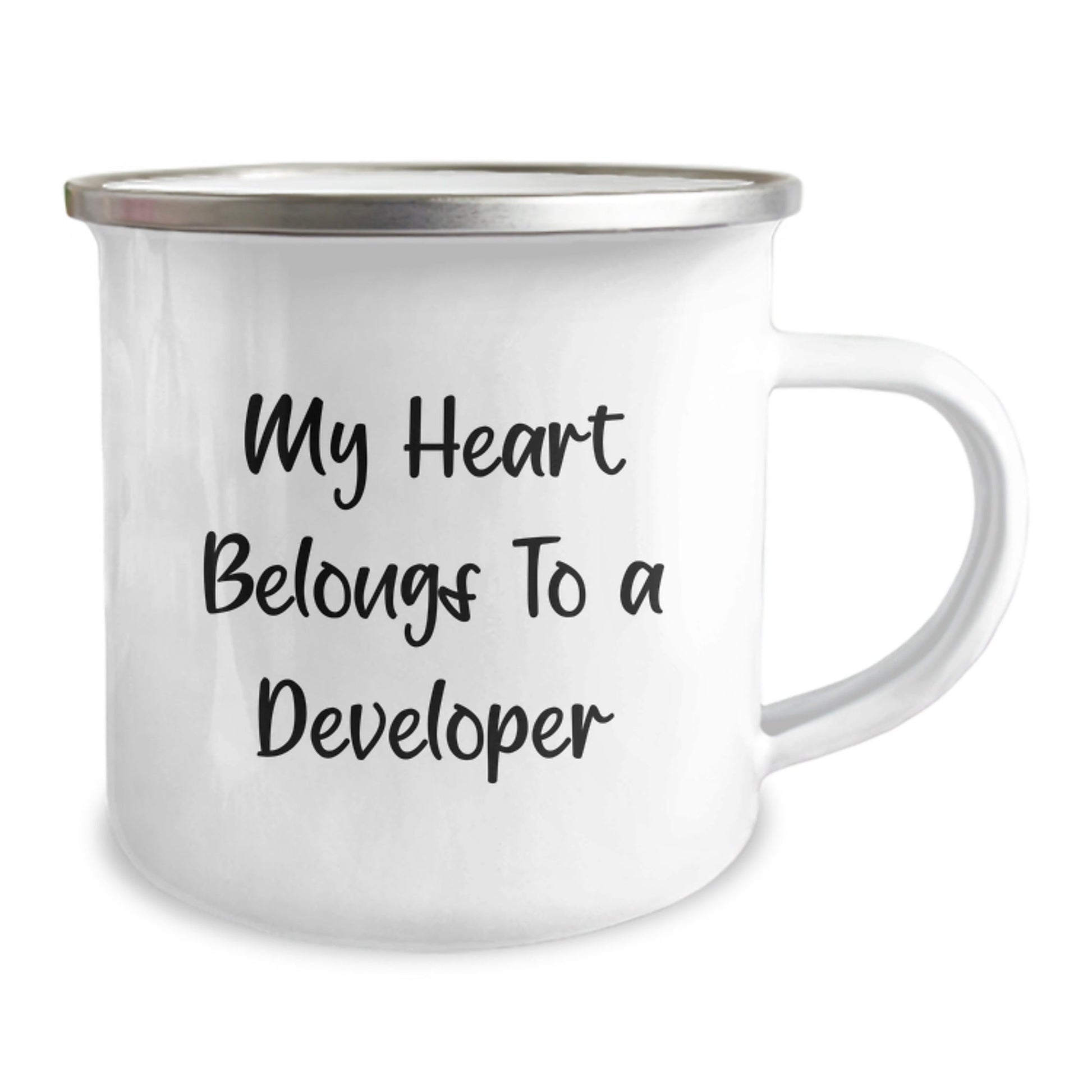 - This 'My Heart Belongs To A Developer' Camping Mug is a thoughtful gift for any developer's birthday, celebrating their love and dedication to coding and problem-solving. Perfect for sipping coffee or tea while working on a project, this 12 oz stainless steel mug with enamel finish is durable and easy to clean. The permanent printing won't fade after washing, ensuring the special message remains visible.