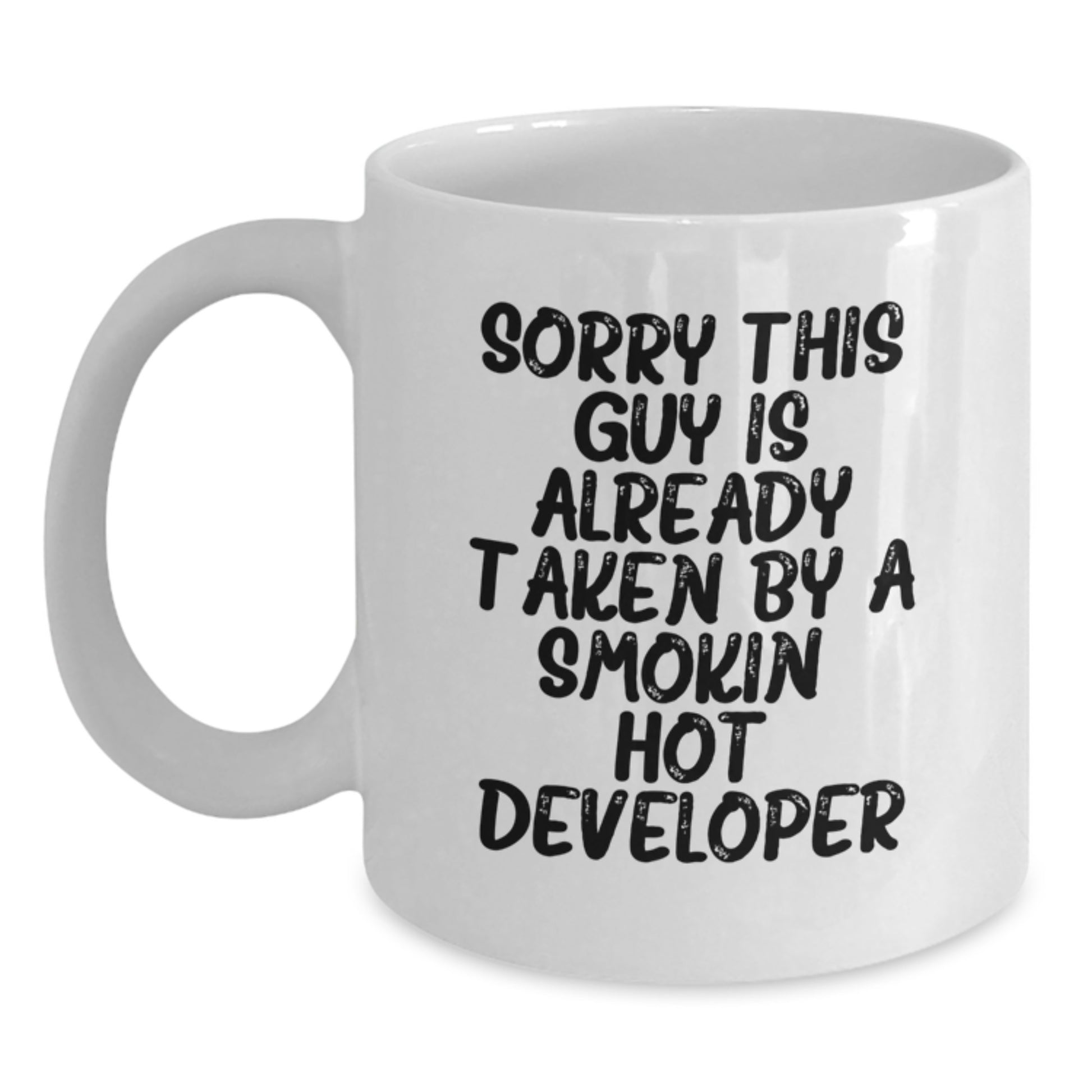 - **The Perfect Gift for Developers**: Make their coding journey a little brighter with this thoughtful white coffee mug. The quote 'Sorry This Guy Is Already Taken By A Smokin' Hot Developer' is a humorous reminder that even the most skilled developers can get caught up in their work.