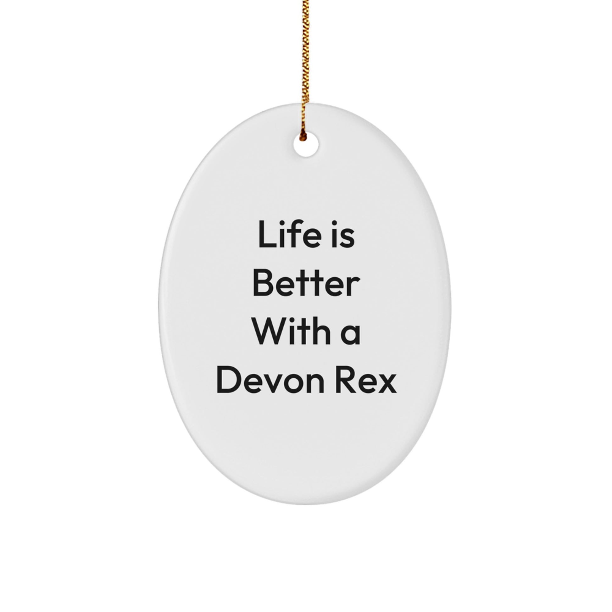 Are you a Devon Rex Cat enthusiast or searching for the purr-fect gift for your favorite feline friend? Look no further! This adorable oval ornament is vibrantly printed with the quote 'Life Is Better With A Devon Rex' and is sure to bring a smile to anyone's face. Made from sturdy MDF with a high-gloss plastic finish, this ornament is lightweight and resistant to breaking, making it a great choice for households with children or pets. It ships with a festive gold cord for easy hanging, perfect for stress-free decorating. Whether you're shopping for gifts for friends, family, or coworkers, this unique and thoughtful gift is sure to be a hit. So why wait? Don't miss out and make this special occasion one to remember!