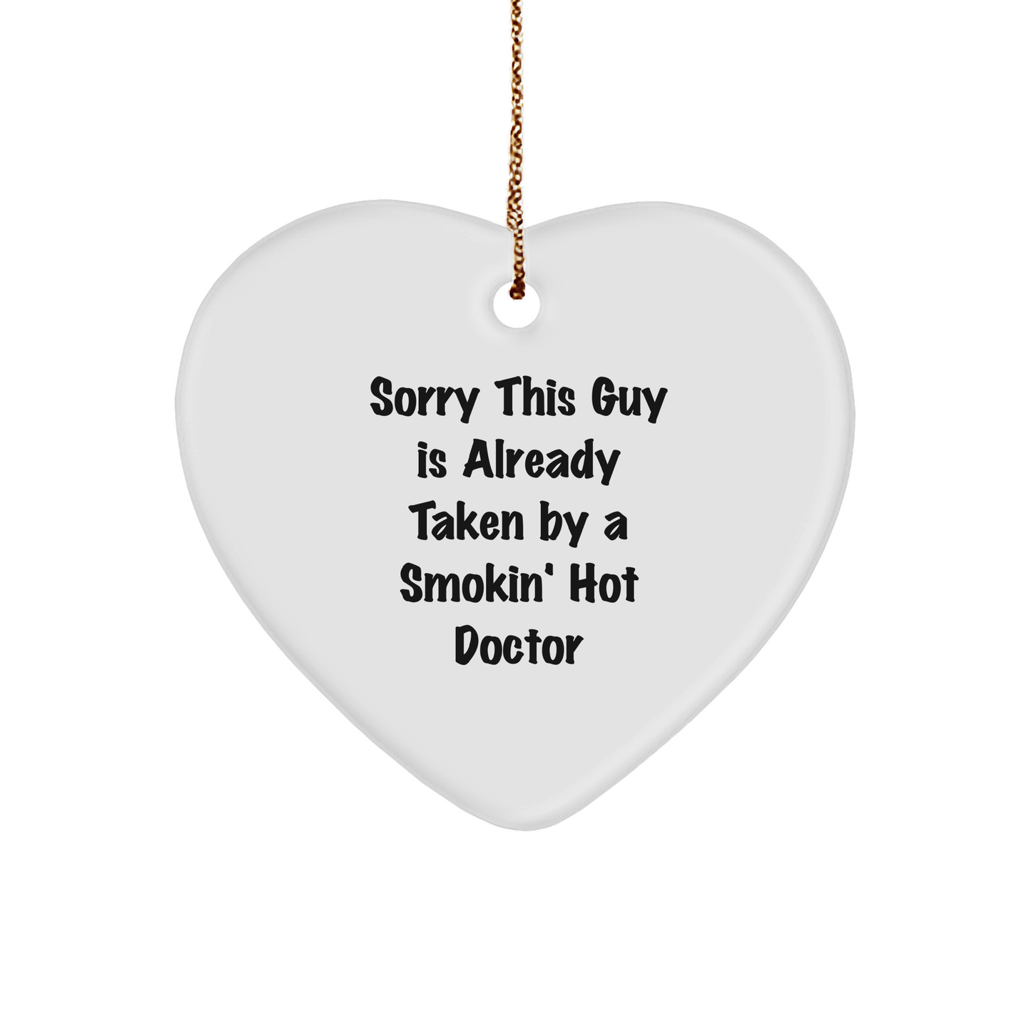 - 'Sorry This Guy Is Already Taken By A Smokin' Hot Doctor' - a unique and witty quote that adds personality to your home decor, making it a thoughtful gift for the special doctor in your life. This heart-shaped ornament is designed to capture the heart of any doctor, with its vibrant colors and durable construction ensuring a long-lasting keepsake.