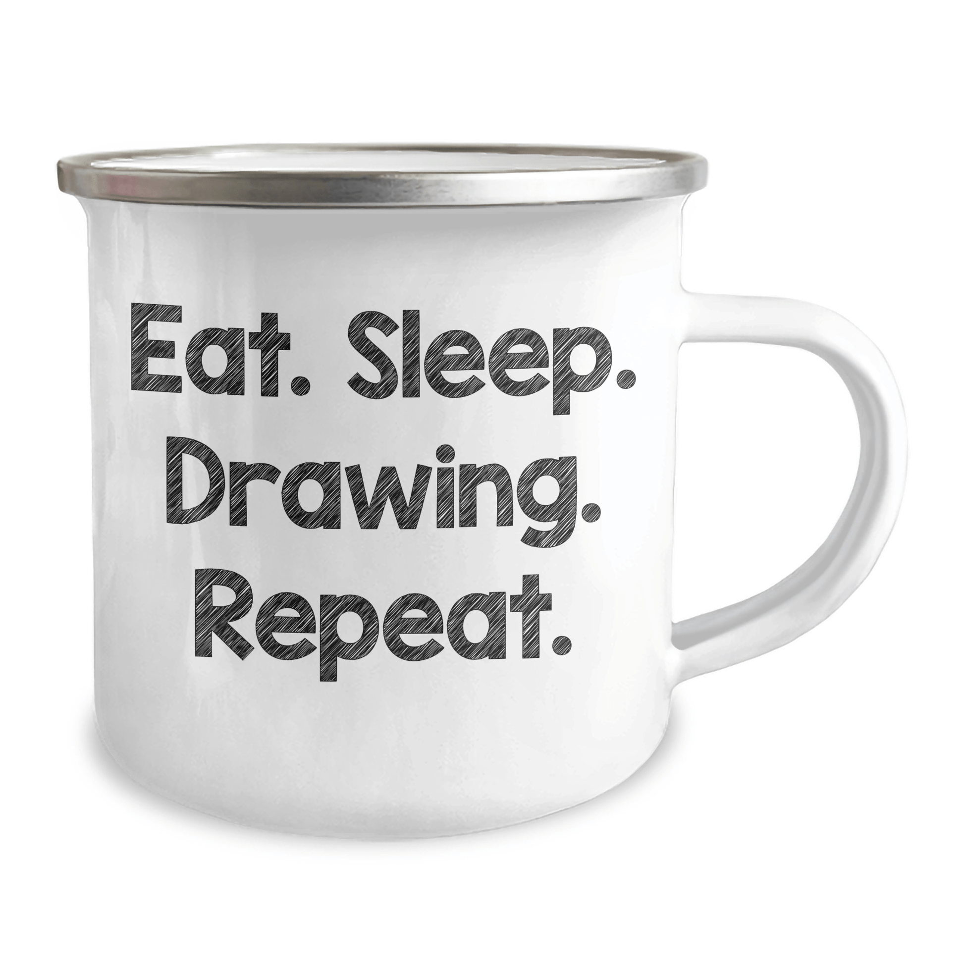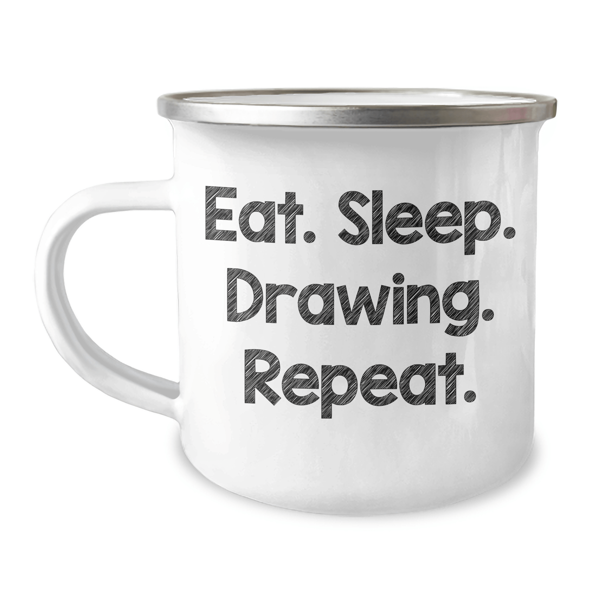 The quote 'Eat. Sleep. Drawing. Repeat.' is a humorous take on the dedication and passion that many artists have for their craft. This Camping Mug is a fun way to show off their love for drawing.