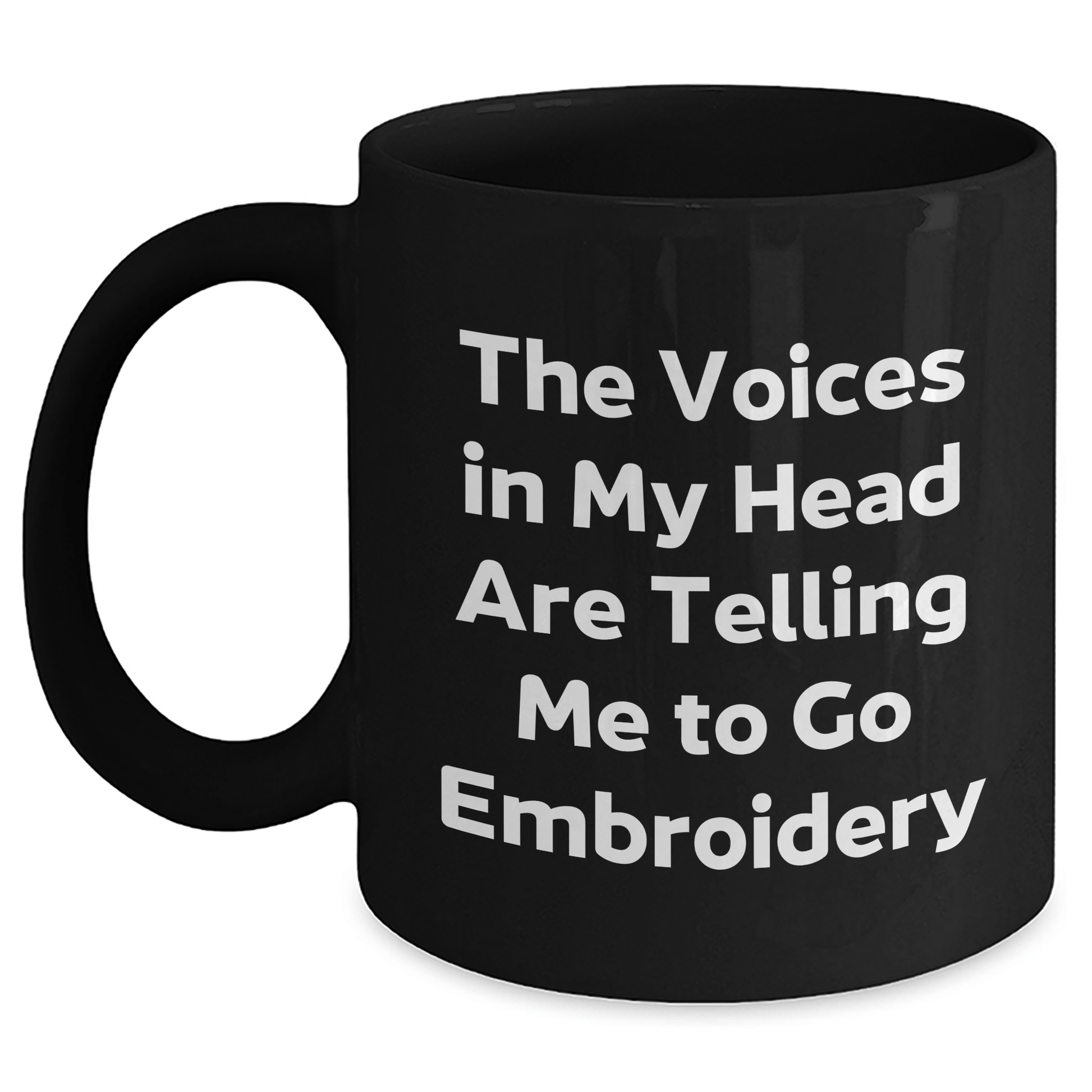 Are you an embroidery enthusiast or looking for a unique gift for someone who loves embroidery? Look no further! This funny black coffee mug is perfect for those who need a little encouragement to pursue their passion for embroidery. The quote 'The Voices In My Head Are Telling Me To Go Embroidery' is a humorous take on the often-quoted phrase and is sure to bring a smile to the face of any embroidery lover.