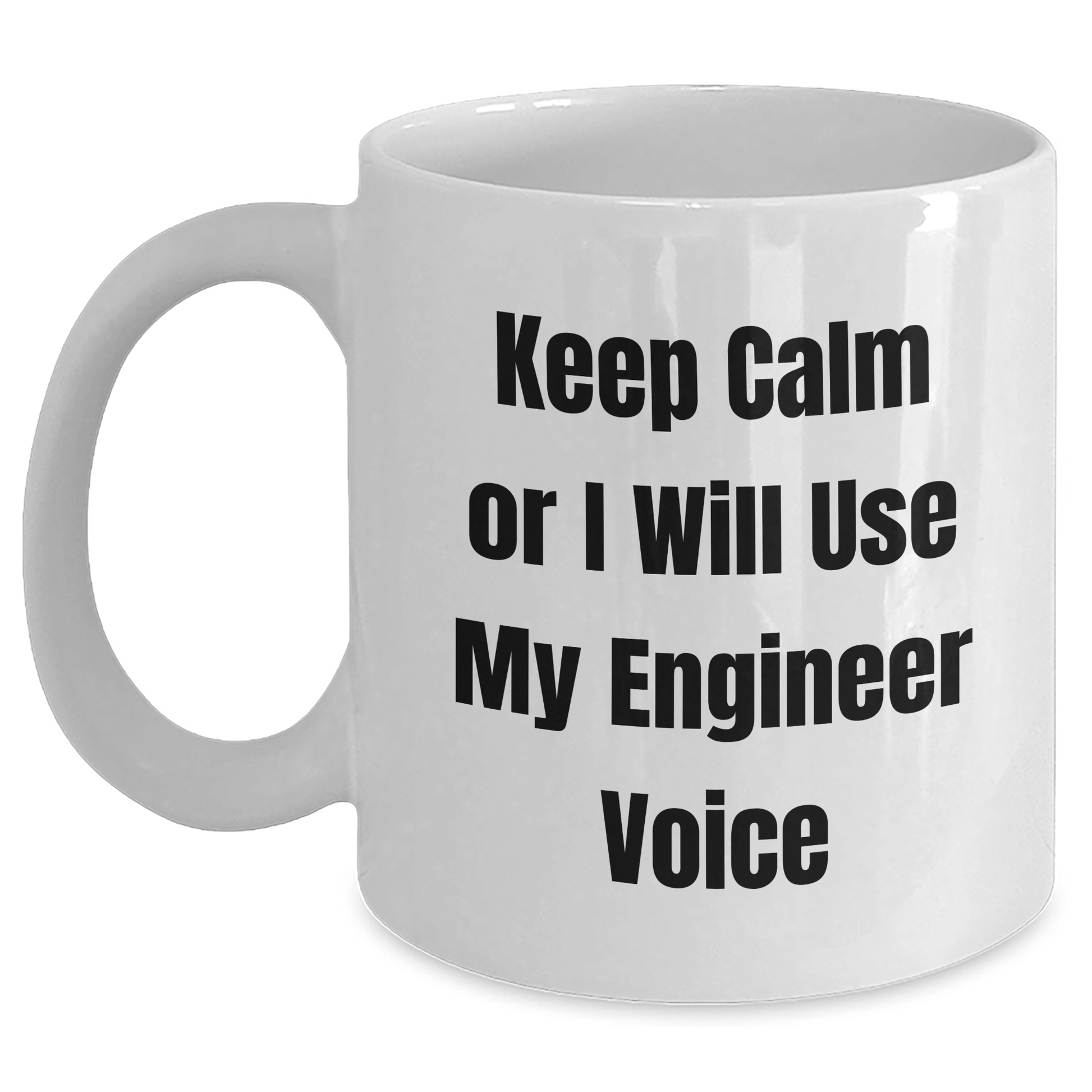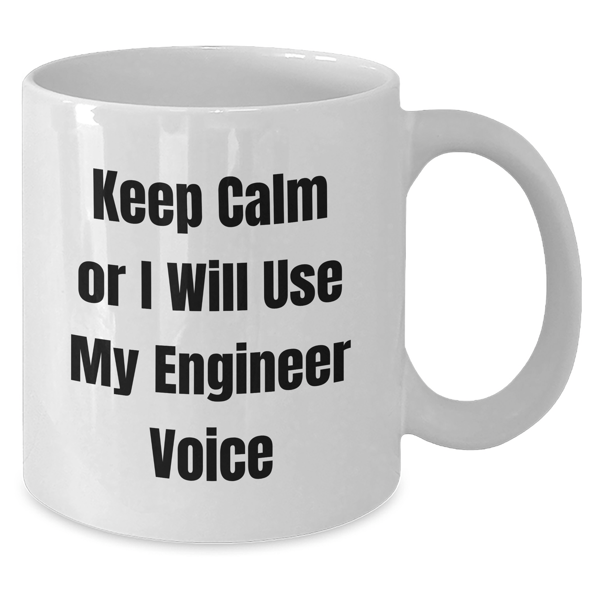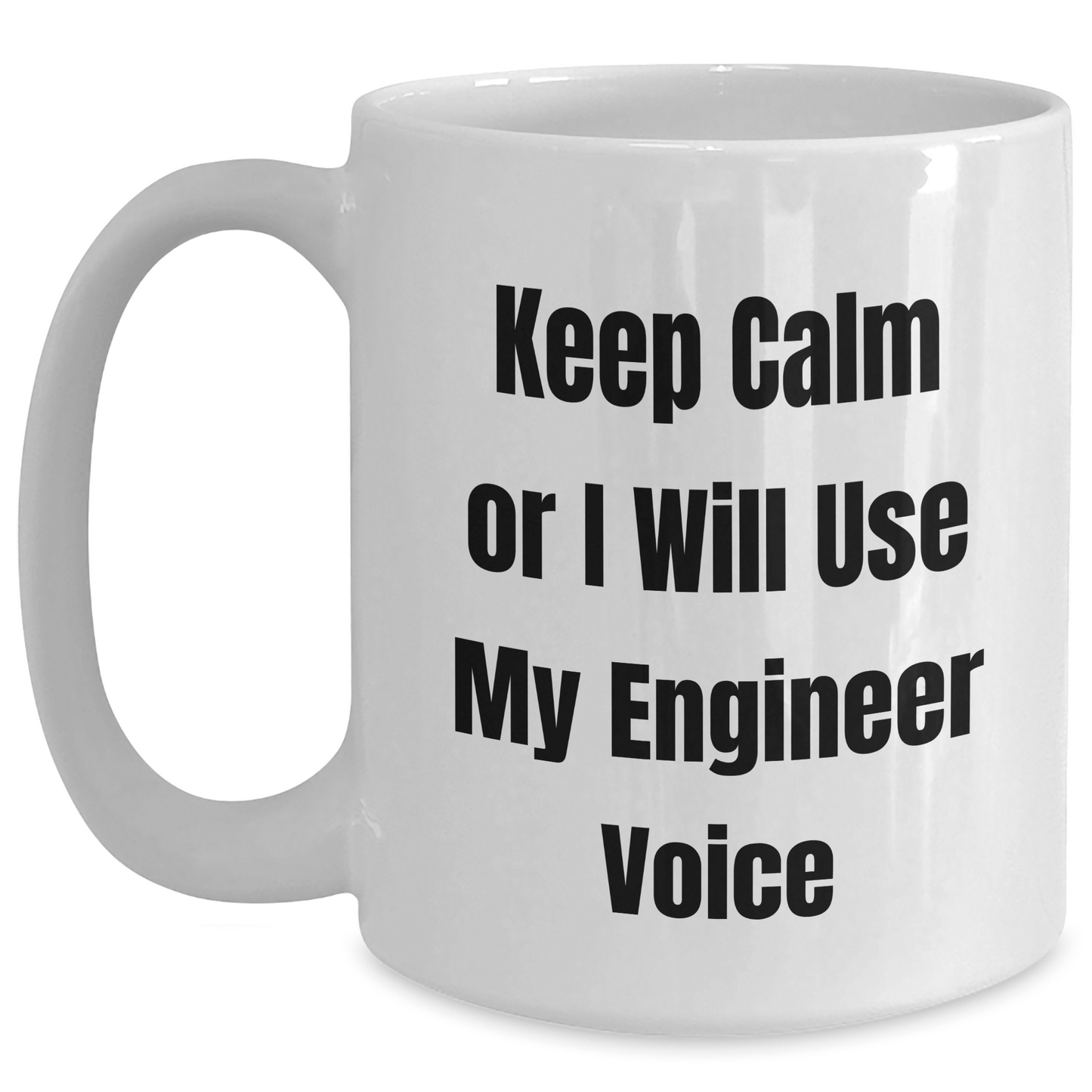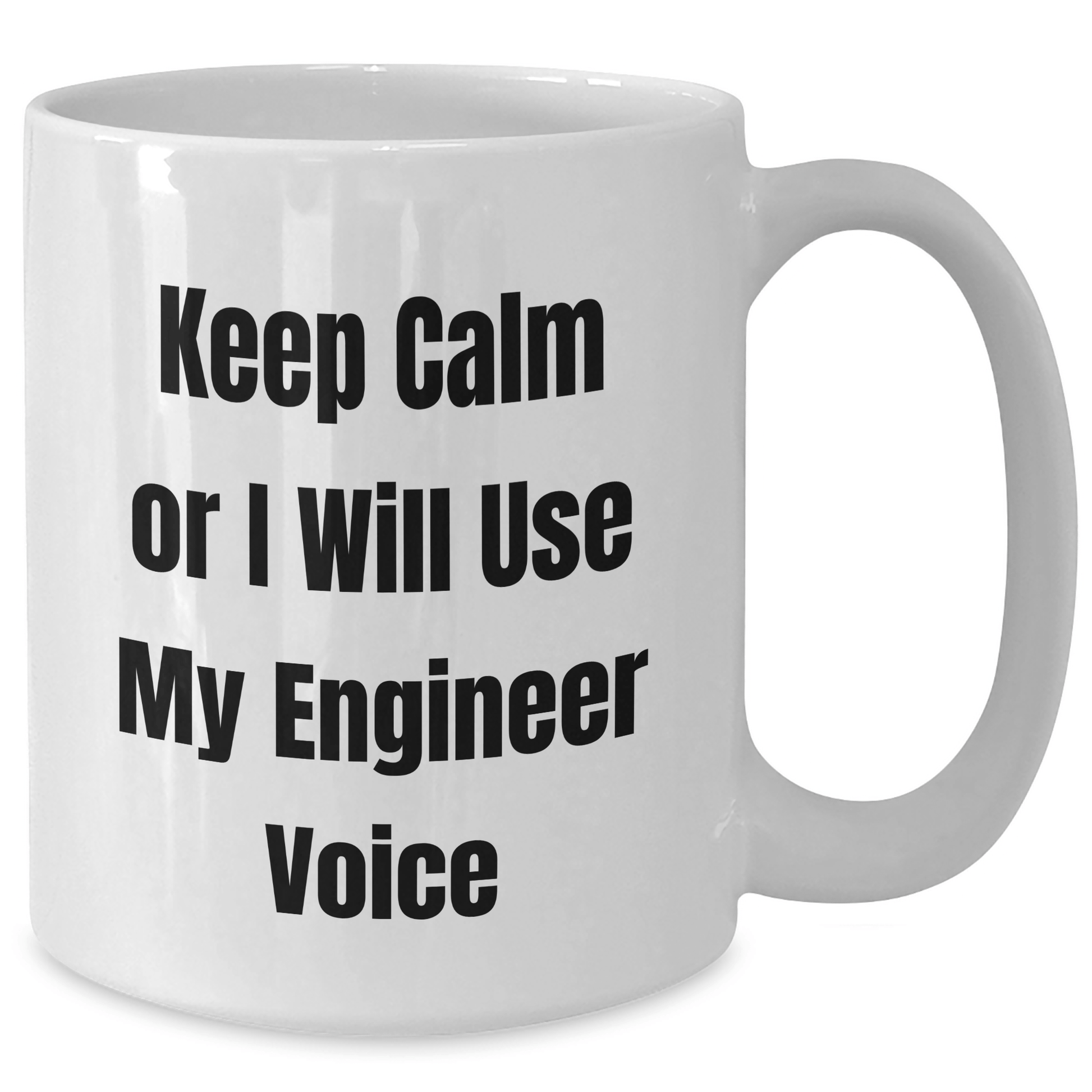 - Elevate your morning routine with our 'Keep Calm Or I Will Use My Engineer Voice' White Coffee Mug, designed specifically for engineers and coffee lovers alike. The sturdy ceramic construction ensures durability and easy handling. Perfect for daily use, it's a thoughtful gift for engineering graduates or a fun way to express your love for engineering.